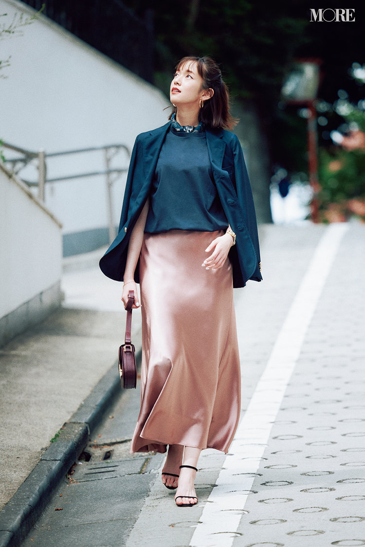 知的なネイビーのポロニットは、上品なベージュのサテンスカートを合わせて全方位から好印象間違いなしのオフィスコーデに仕上げて。ポロニットの大きめの白ボタンが上半身に軽やかさをプラスしてくれるし、トップスをinして腰高に見せれば、足もとは頑張らないローヒールでOK。ツヤのあるおちゃめなとんがりシューズで可愛げも。
