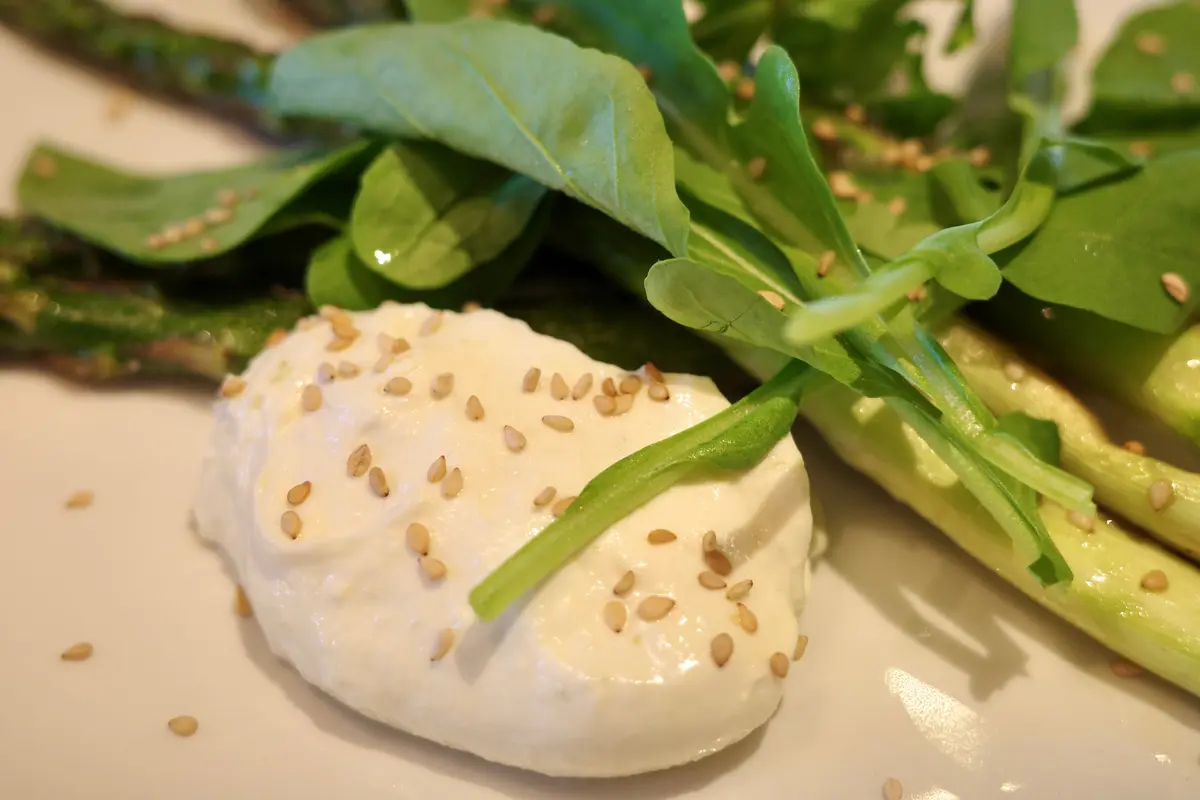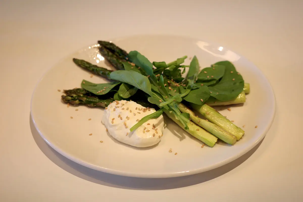 前菜はセサミオイルで香ばしくグリルされたアスパラガス。