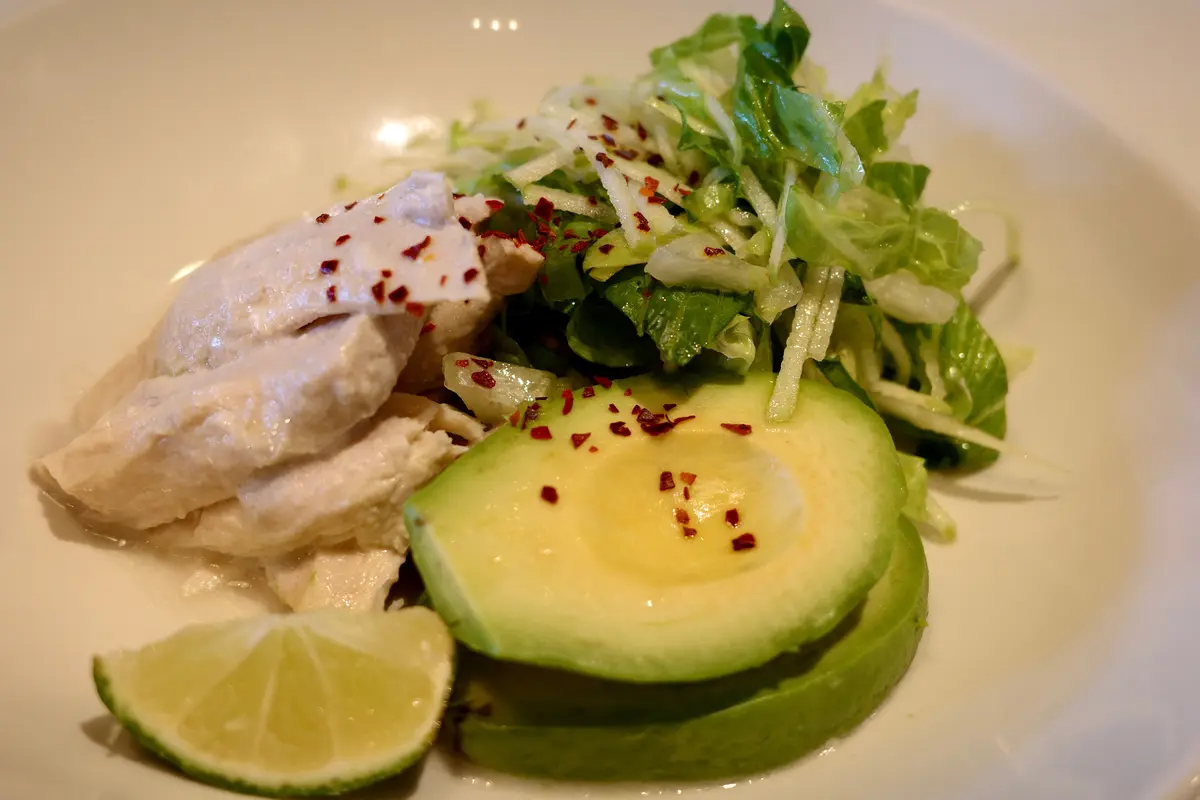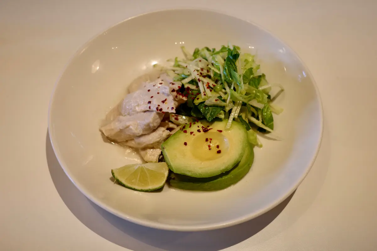 贅沢に半分入ったアボカドと、グリーンアップルやクレソンのサラダに、
