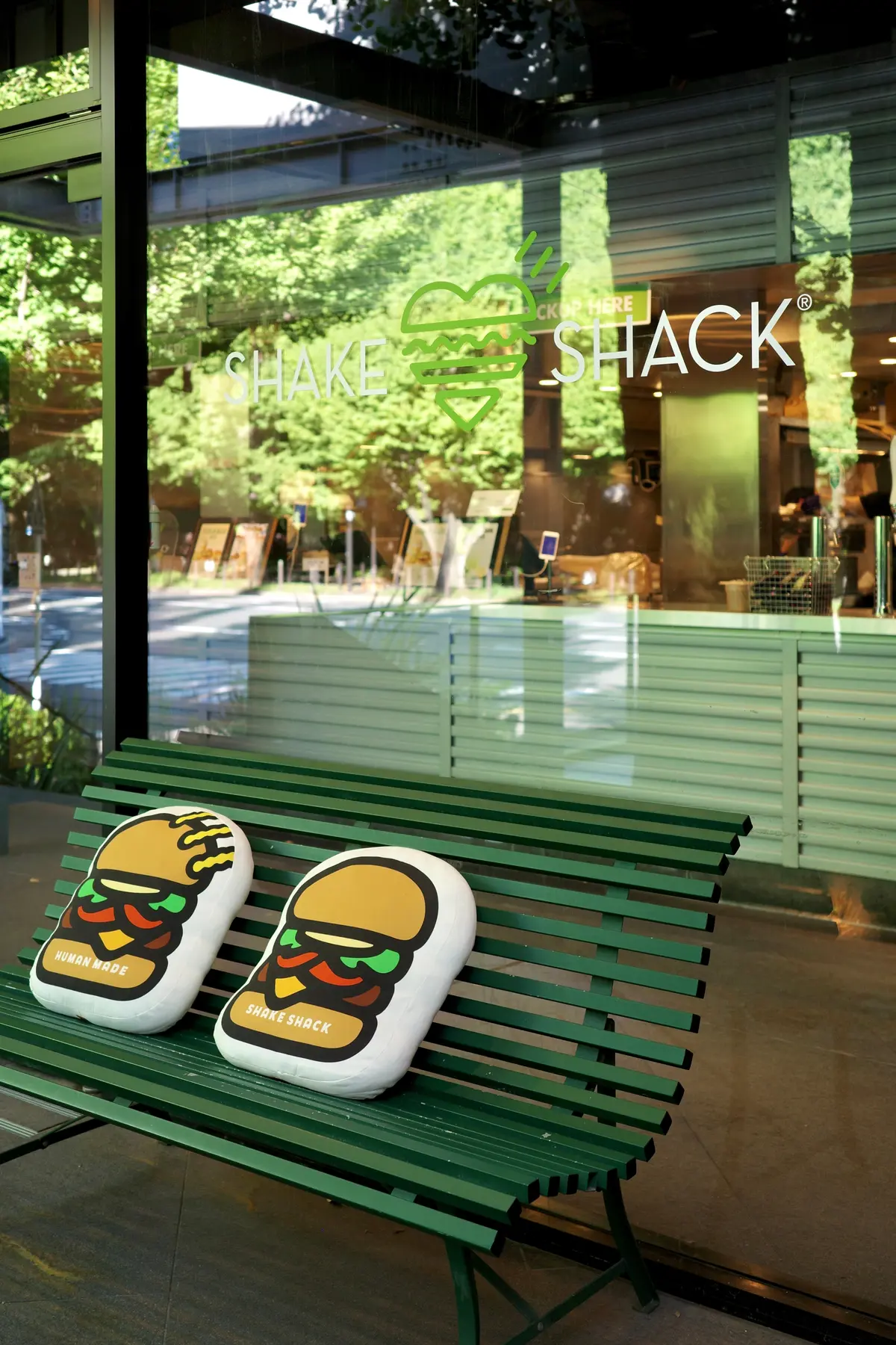 コラボレーション期間のみ、外観や店内がShake Shackの象徴的なバーガーアイコンと、