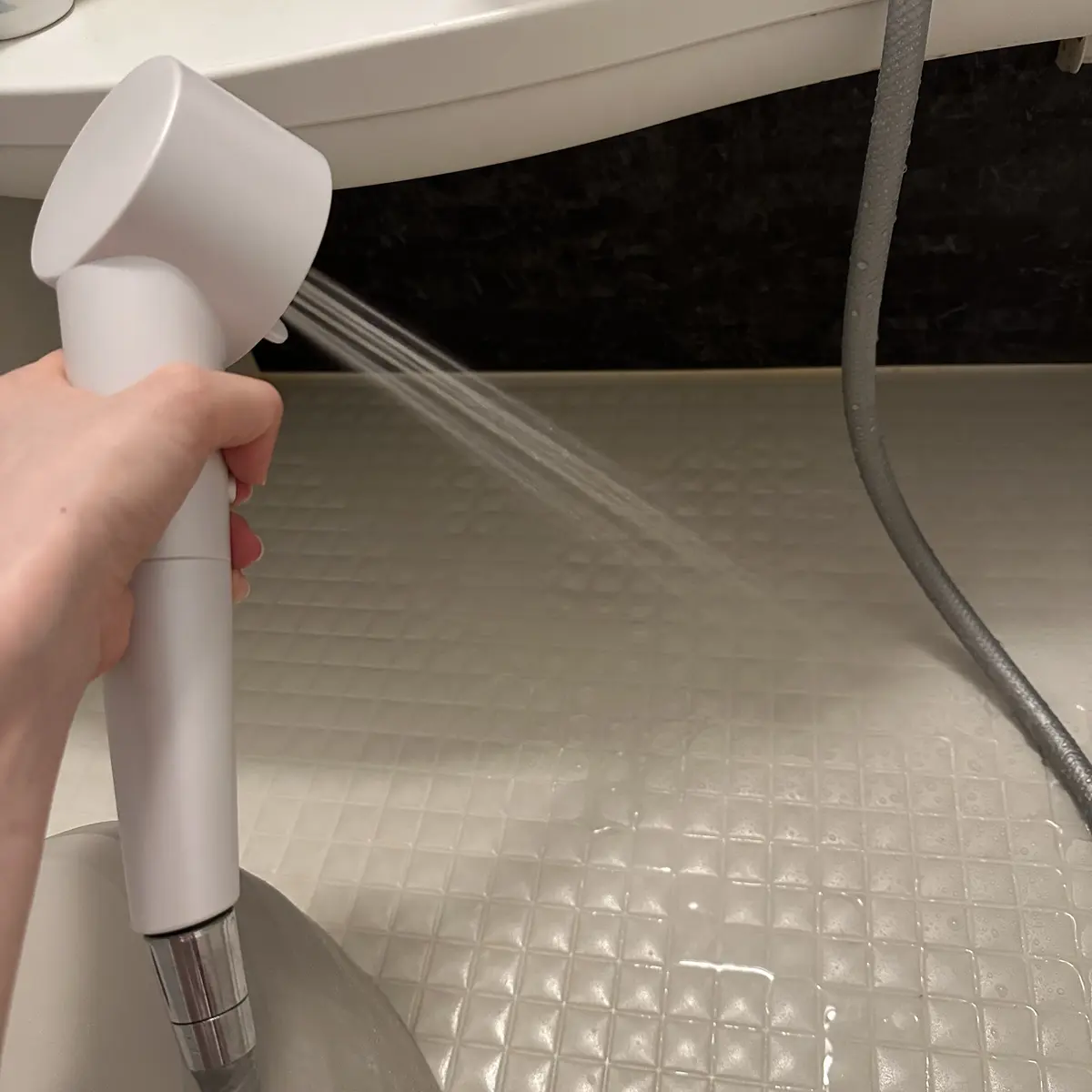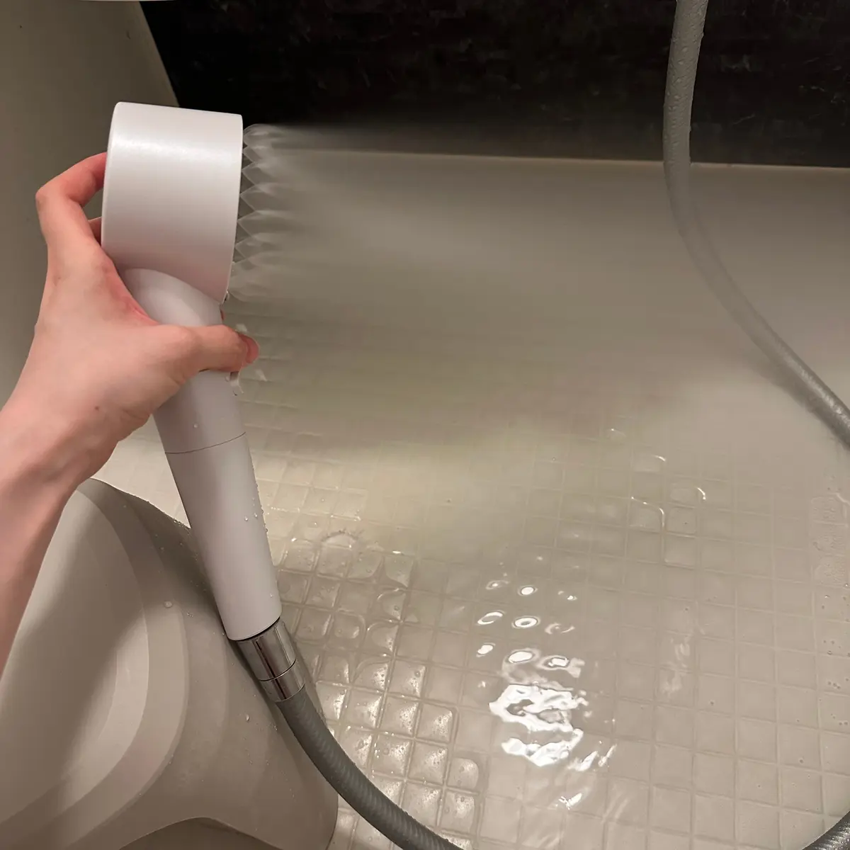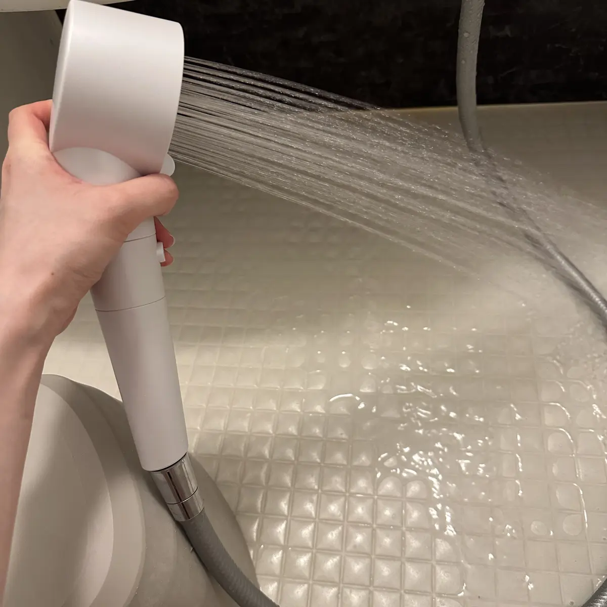 浴槽にはったお湯にシャワーヘッドを入れると、空気を圧縮させた超微細な泡が浴水に混ざるため、白濁した炭酸風呂を自宅で簡単につくれる。✨ お風呂屋さんにあるジェットバスを自宅でも作れるのめっちゃありがたい、、炭酸風呂って血管にもいいんですよね(⸝⸝◜~◝⸝⸝)