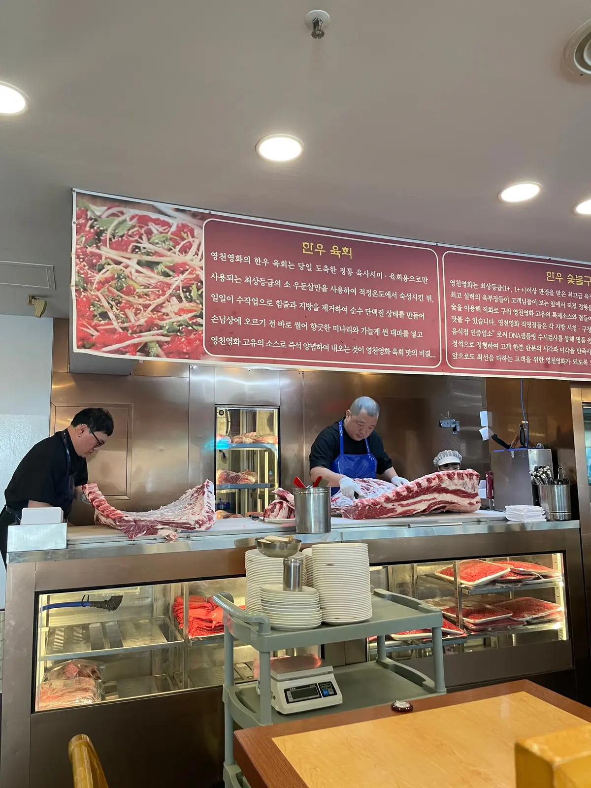 毎朝、畜産市場から新鮮な韓牛を仕入れ、店内1階のオープンキッチンではお肉を加工している様子も見られます。