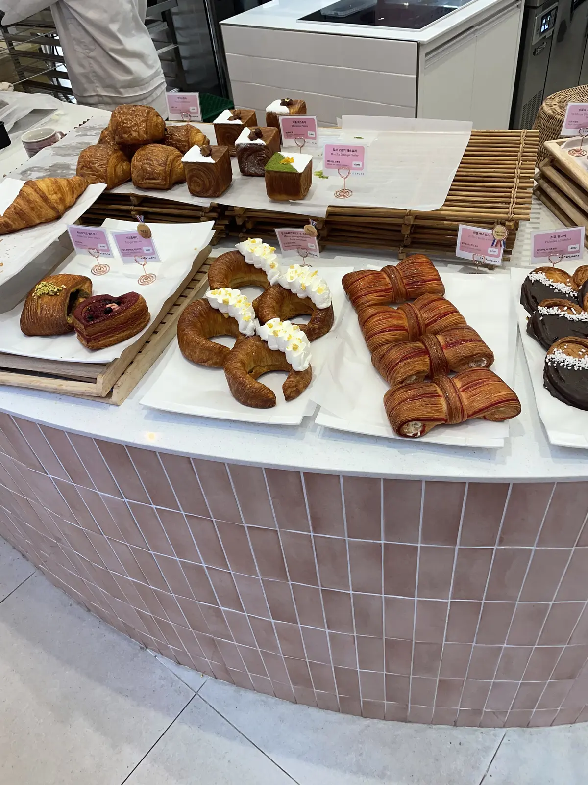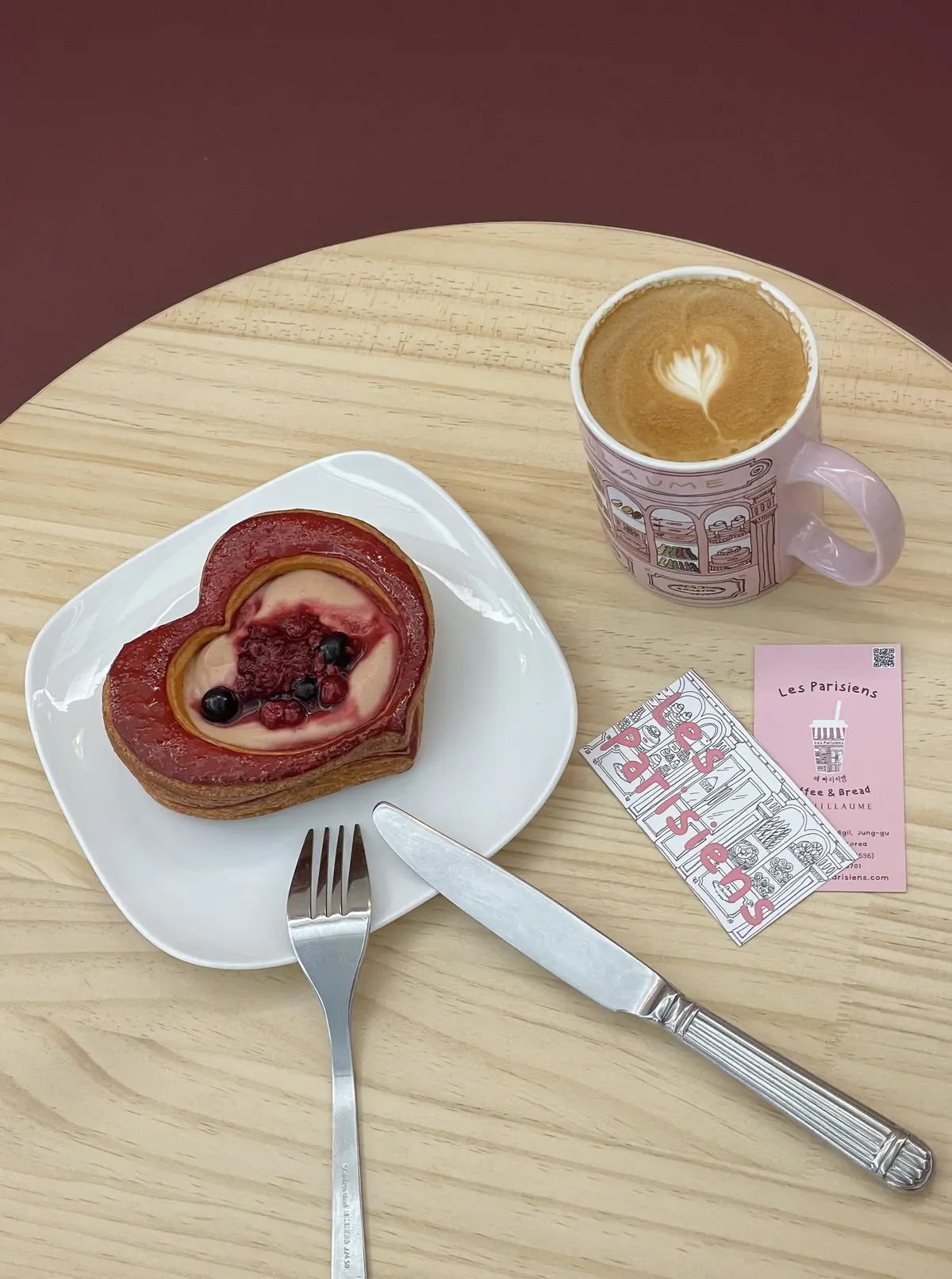 甘いものからお惣菜系まで種類も豊富でハートやリボンなどの心踊るパンが多く、私はラズベリーの入ったハートのデニッシュとカフェオレを頼みました🥐☕️