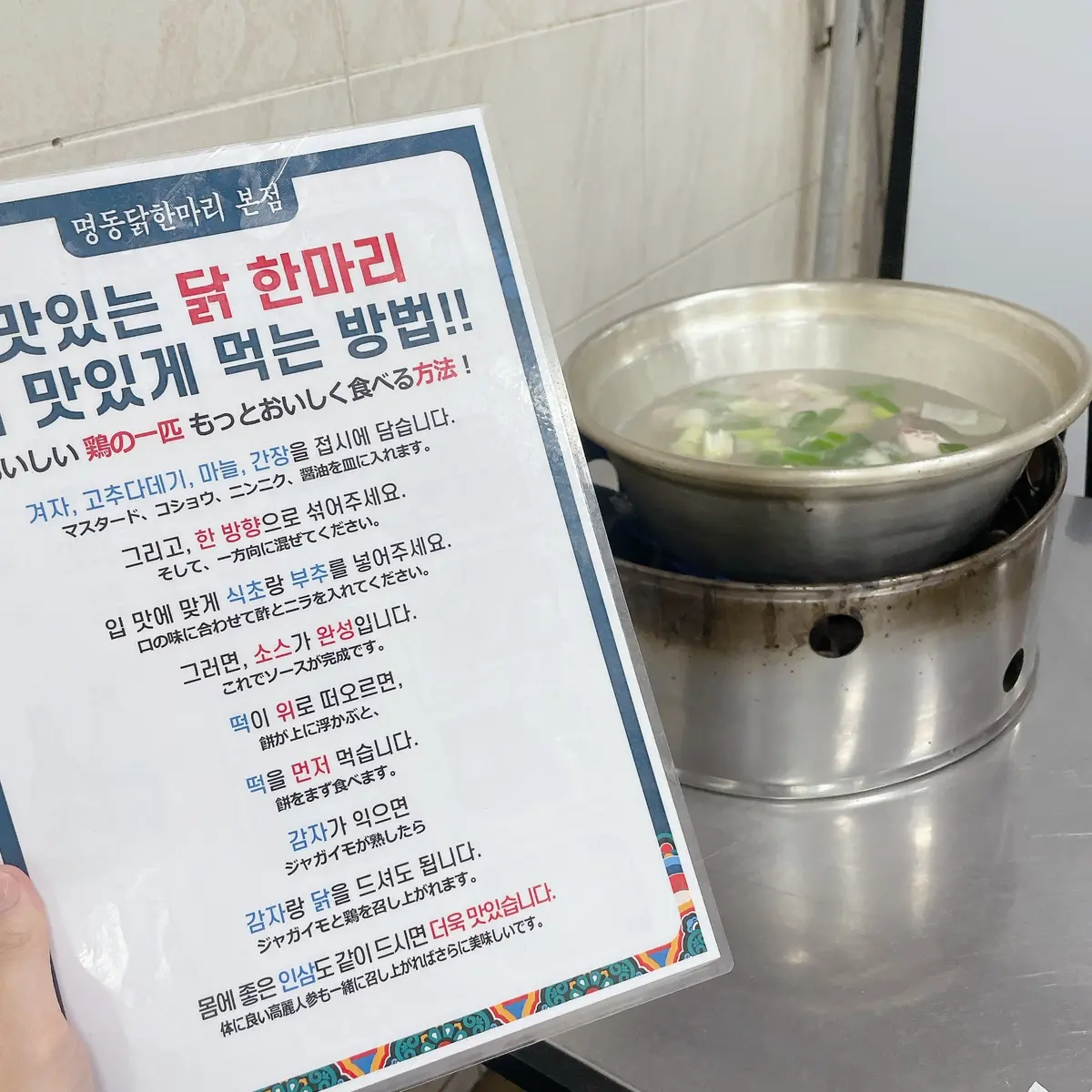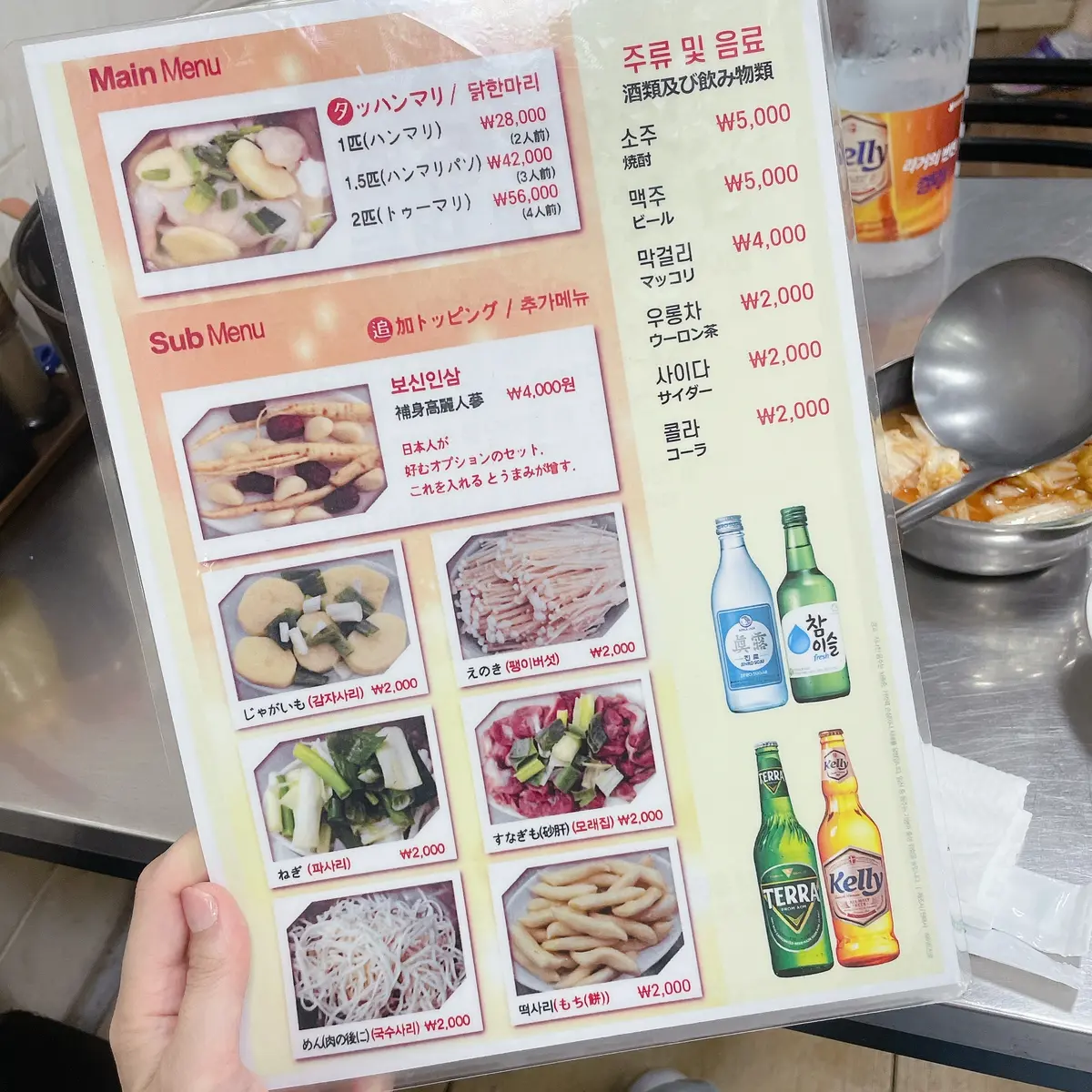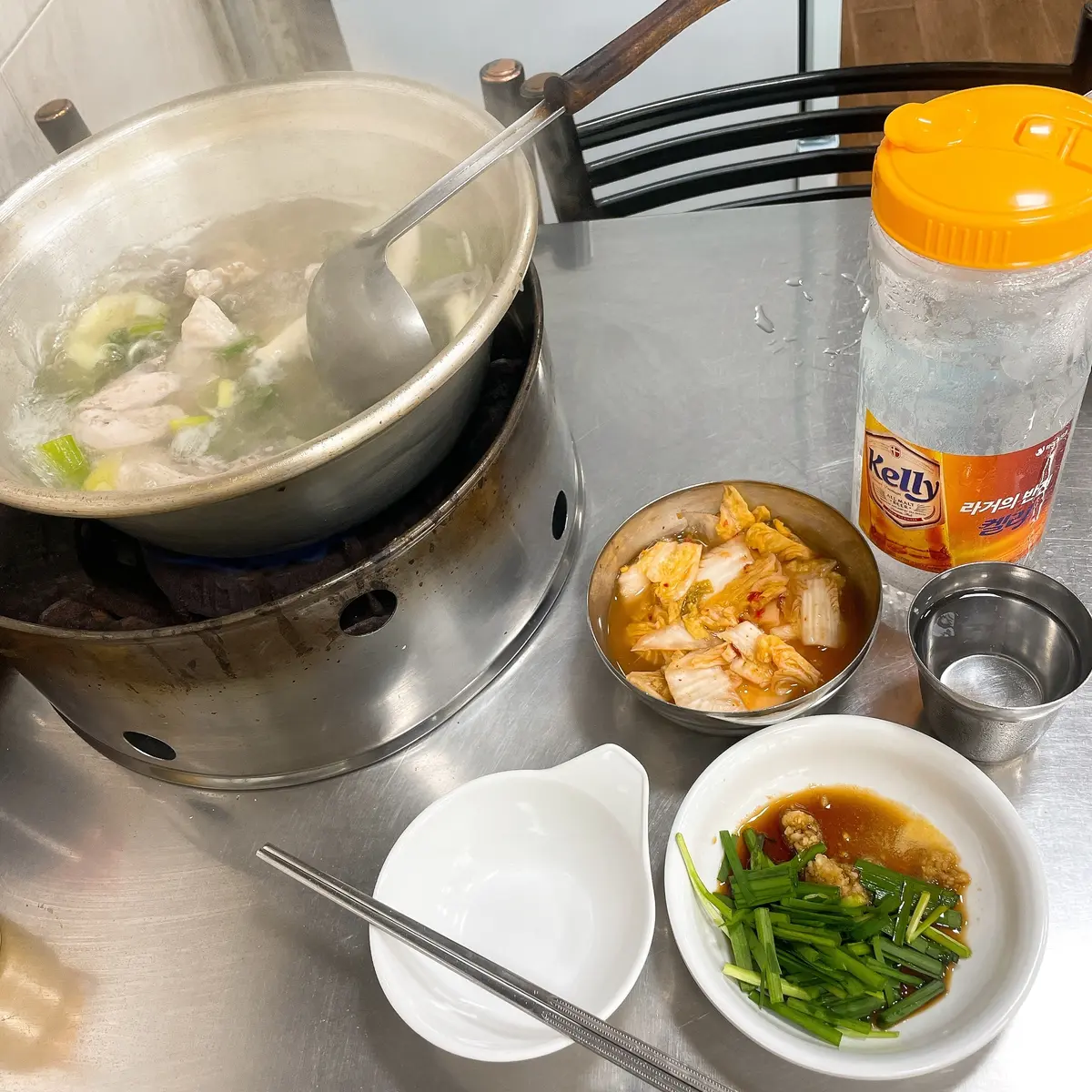 「タッカンマリ」は“鶏一羽”という意味で、鶏を丸ごと煮込んだ水炊きのような料理。スープは塩味ベースでとてもあっさり。コラーゲンたっぷりで美容にも◎。お好みで辛いタレを付けてもいいが、基本は全然辛くない。冬にぴったり、体がぽかぽか温まる一品。
