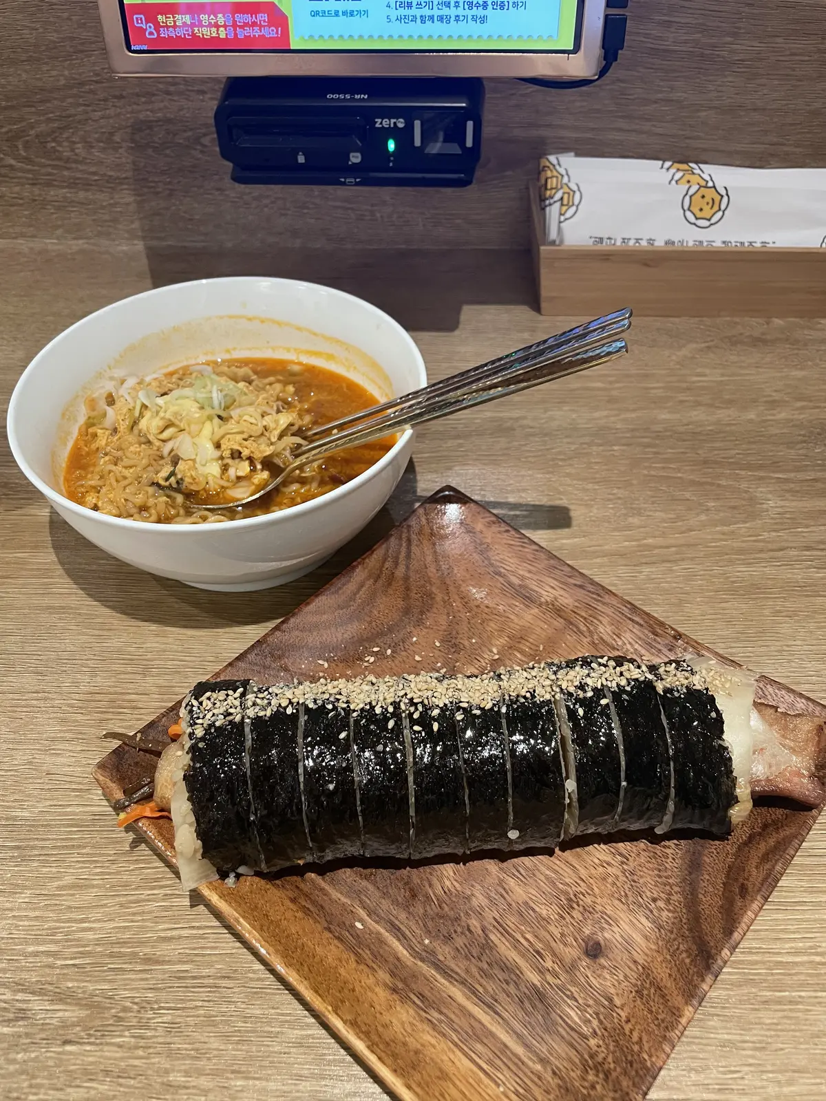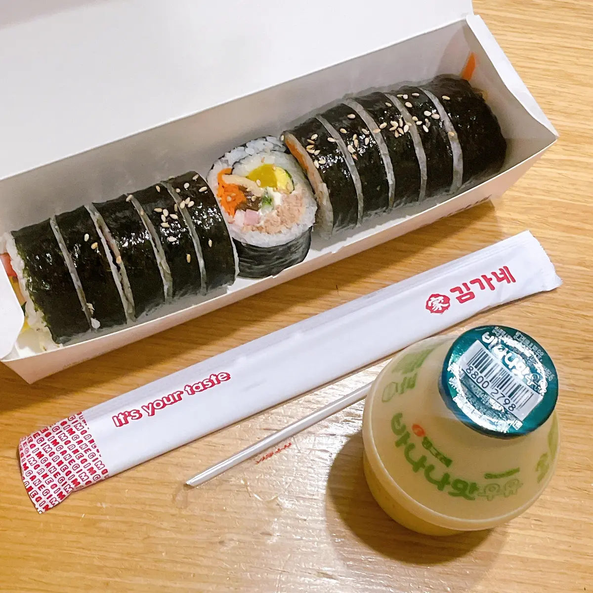 中の具材は、たくあん、にんじん、卵焼き、牛肉など。辛味は基本的に無し。キンパは、外でも中でも手軽に食べられるのが魅力的で渡韓した際は絶対食べるくらい大好きです!