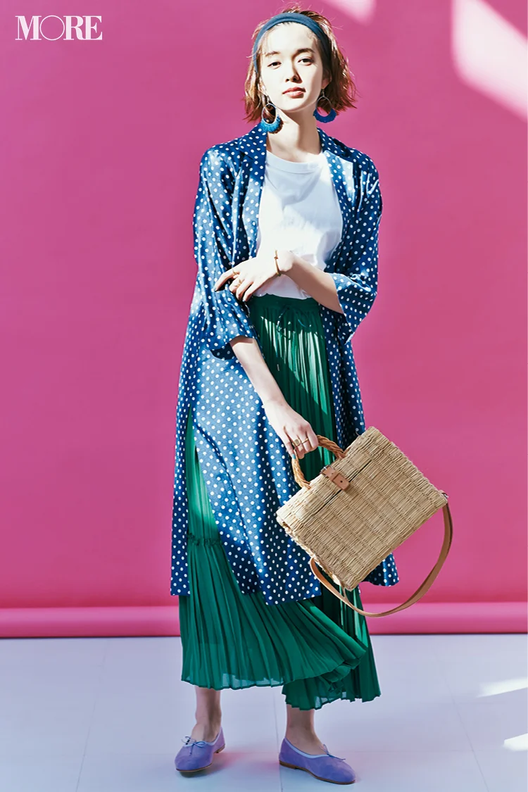 鮮やかなグリーンのアコーディオンプリーツスカートにドット柄のガウンをはおって、華やかコーデで待ち合わせ。インは白のタンクトップでちょいカジュアルに、足もとはバレエ靴で可愛さも歩きやすさも完璧に。さらにヘアターバンやフリンジピアス、かごバッグでテンション高めに仕上げたら、彼も「一緒にいて楽しい♪」って好感触!