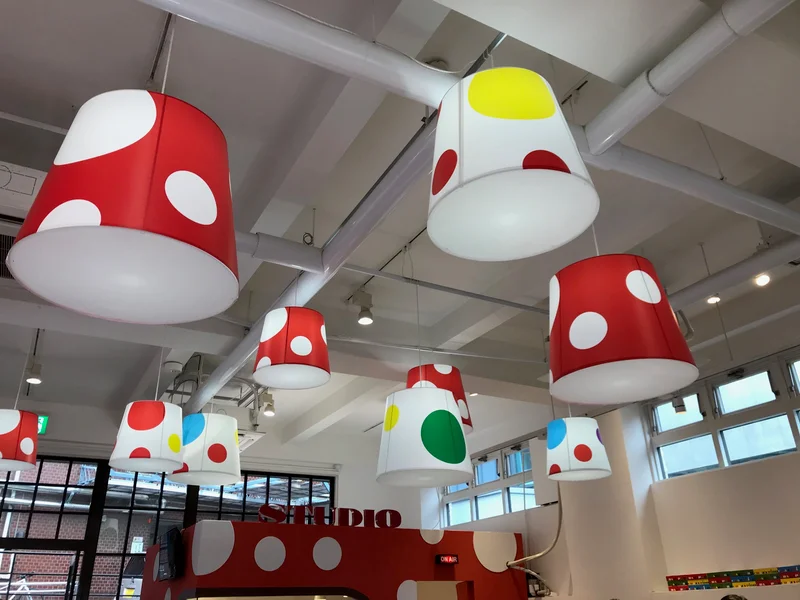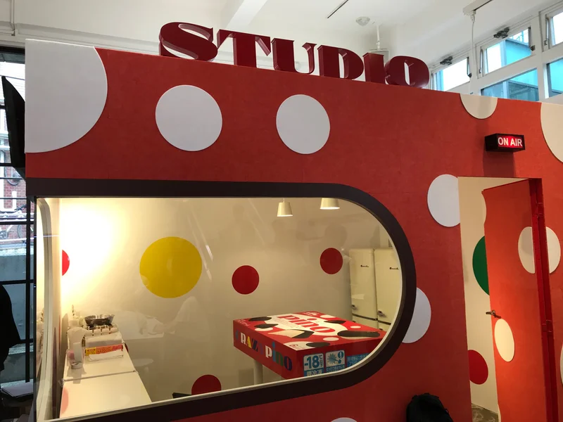 スタジオ内はカラフルでポップ。ユニークな空間に、さっそく心が踊ってきたぞぉ! まずは席選び。空いている席に自由に座ることができるから、自分なりのベストポジションを確保して。 -