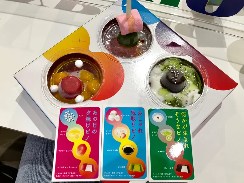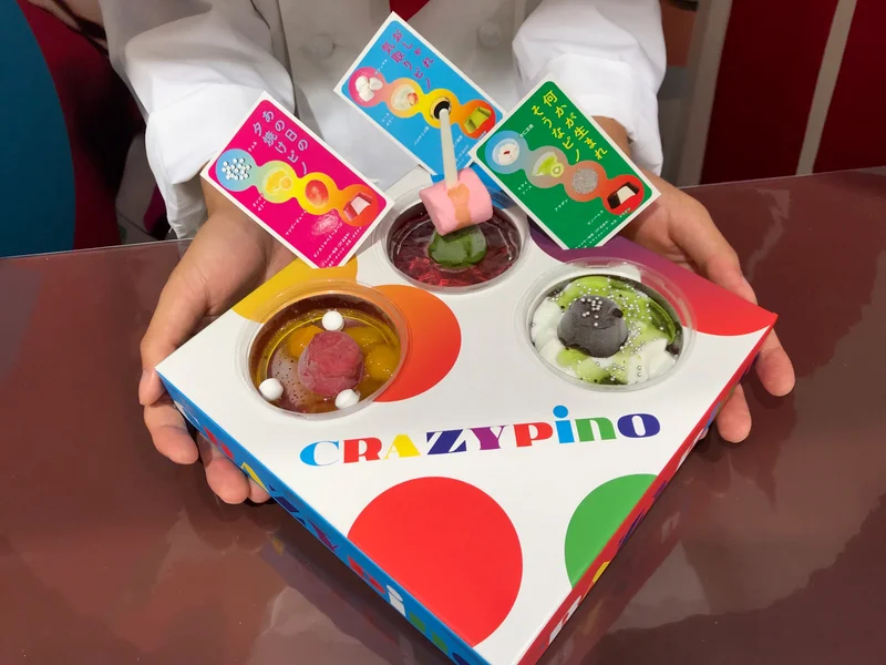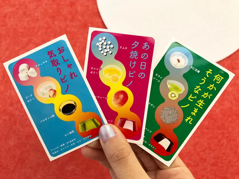 私が引き当てた「CRAZYpino」は、杏仁豆腐やキウイソースと組み合わせた「何かが生まれそうなピノ」。ラムネやマンゴーピューレと合わせた「あの日の夕焼けピノ」。そして、マシュマロやバルサミコ酢と合わせた「おしゃれ気取りピノ」の3粒☆ 「CRAZYpino」には、1つ1つユニークな名前がついているのもおもしろポイントです。 -