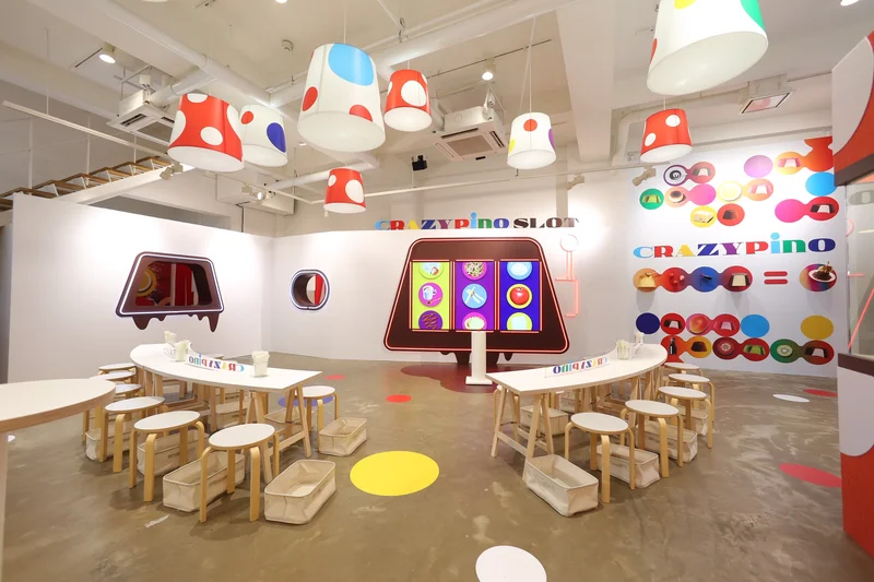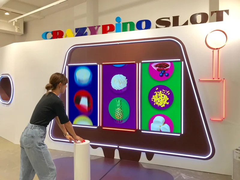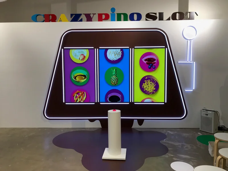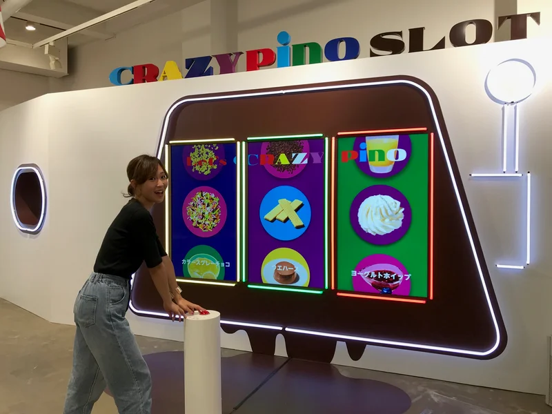 会場中央に、ピノの形をした巨大スロット「CRAZYpino SLOT」が設置されています。このスロットを回して、ランダムに選ばれた食材と「ピノ」を組み合わせることで、「CRAZYpino」が完成します! -
