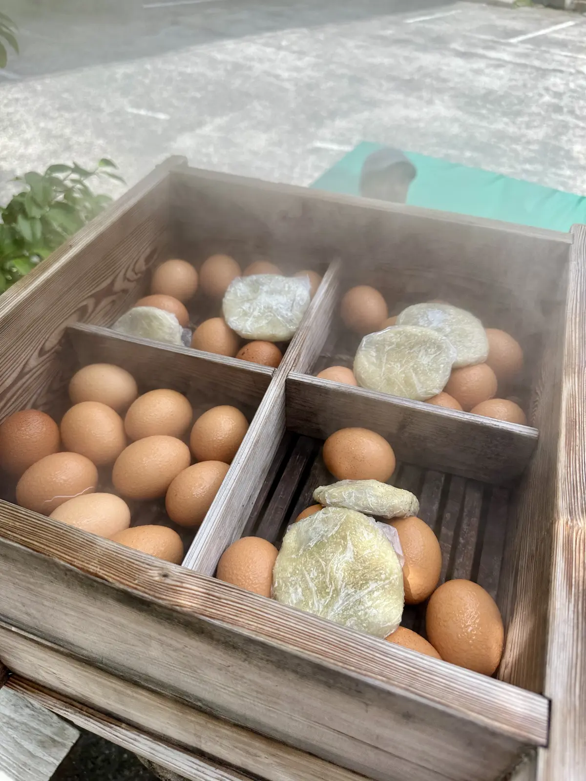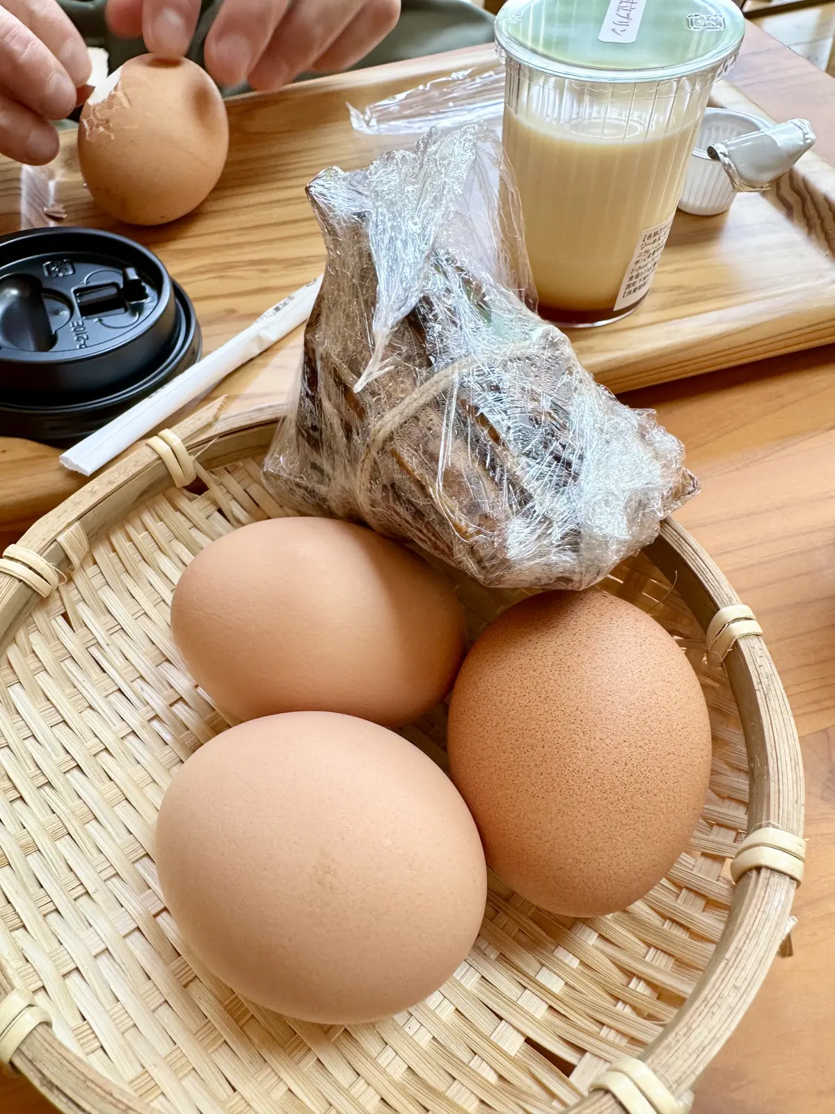 まずは「蒸し卵」。11分蒸された卵の黄身はしっかり中まで加熱されていて、温泉の香りがほんのり移っています。いつものゆで卵とはひと味違う!塩なしでも美味しく食べられました。