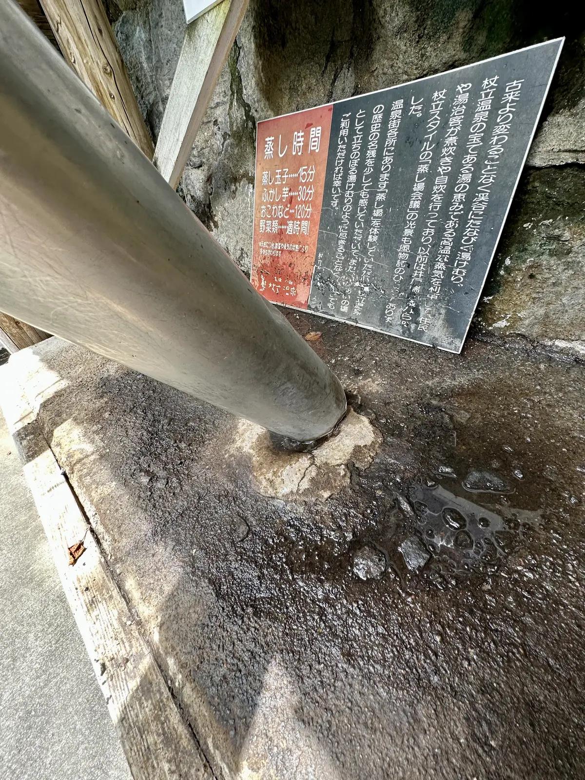 杖立では、温泉の地熱を使って誰でも食材を蒸せる「無料の蒸し場」がいくつか点在しています。蒸し場の横には蒸し器、トング、タイマーまで完備されている場所もあり、まるで“野外の蒸し料理キッチン”!