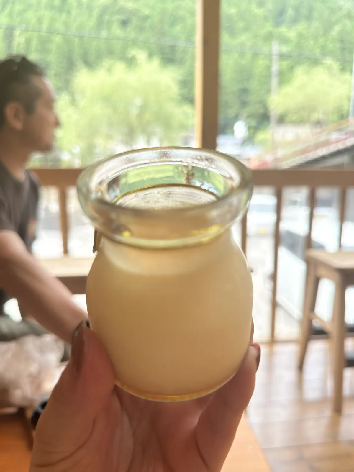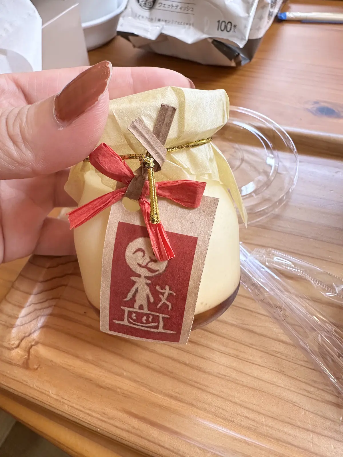 渓谷を眺めながら、快晴のテラス席でいただくプリン。絶品です。杖立温泉を守るマスコットキャラクター、「杖じぃ」もいい味を出しています。