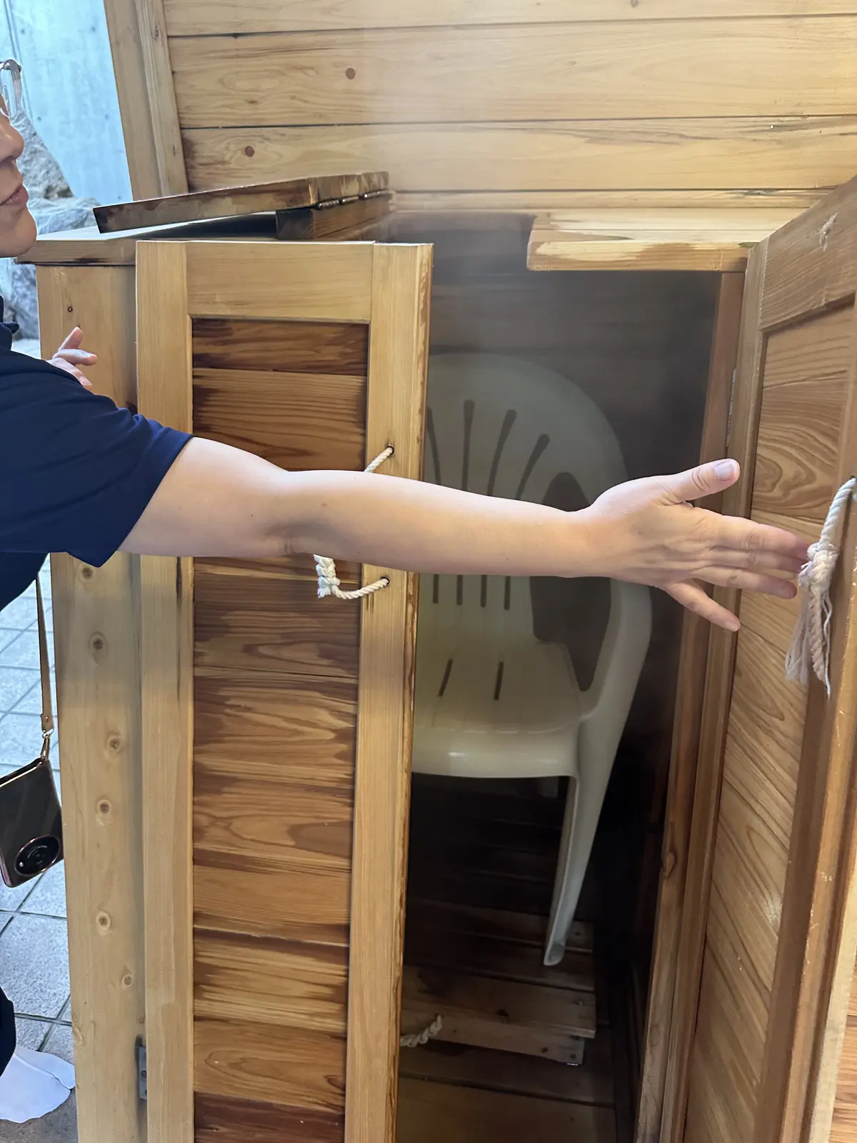 写真のむし風呂は中の椅子に腰掛け、顔だけ出してサウナを楽しみます。なんと、温泉の発祥よりも古来から存在した、杖立温泉特有の入浴方法だそうです。