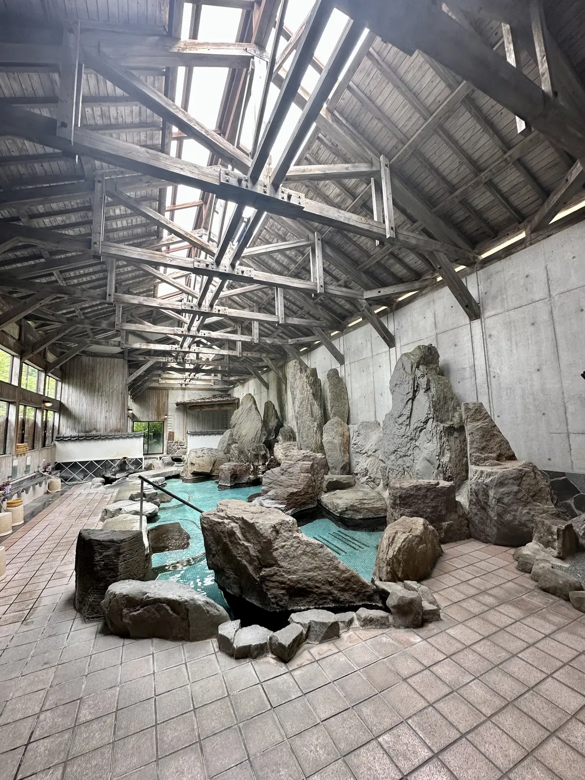 広々とした室内。高い天井。美しい湯面に差し込む日差しがキラキラと輝いています。巨大石の頼もしい存在感に身を委ね、ゆったりとした気持ちになれました。