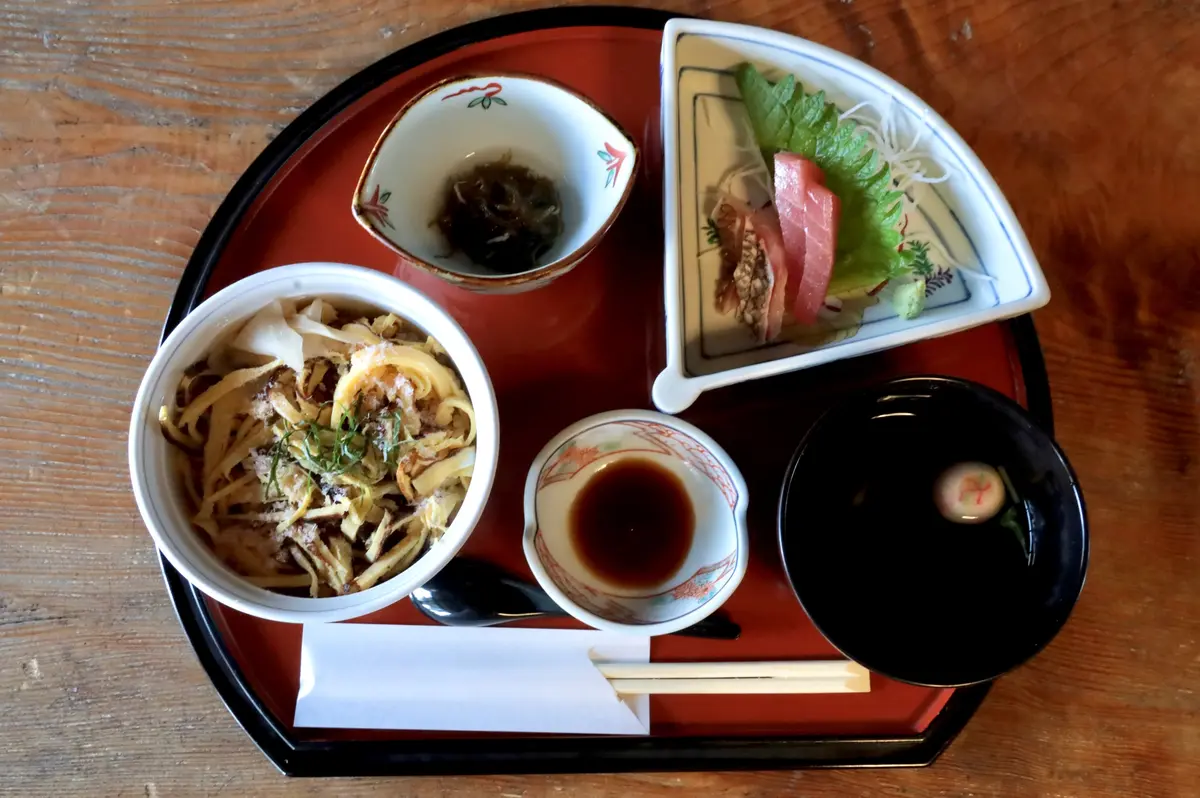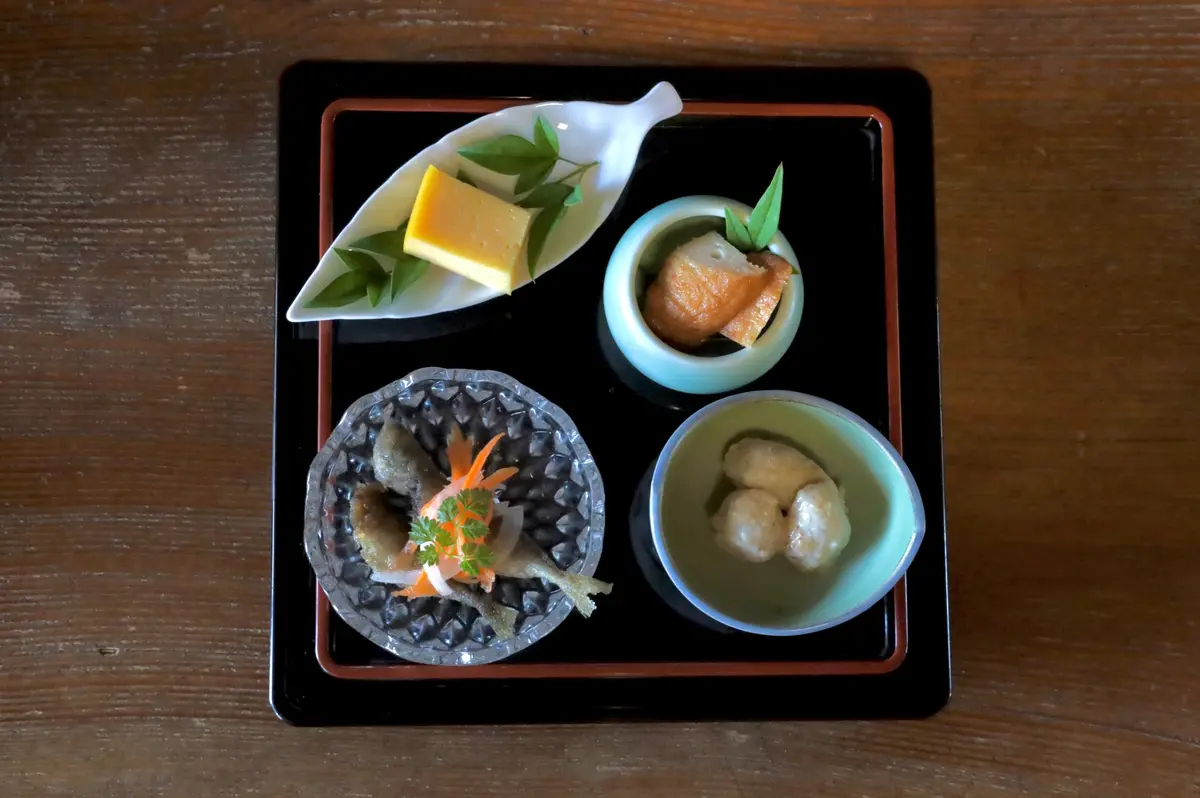 飫肥の名物「おび天」や郷土の味が盛り込まれた豪勢な「服部膳」2200円(税込)の1品のみの提供です。