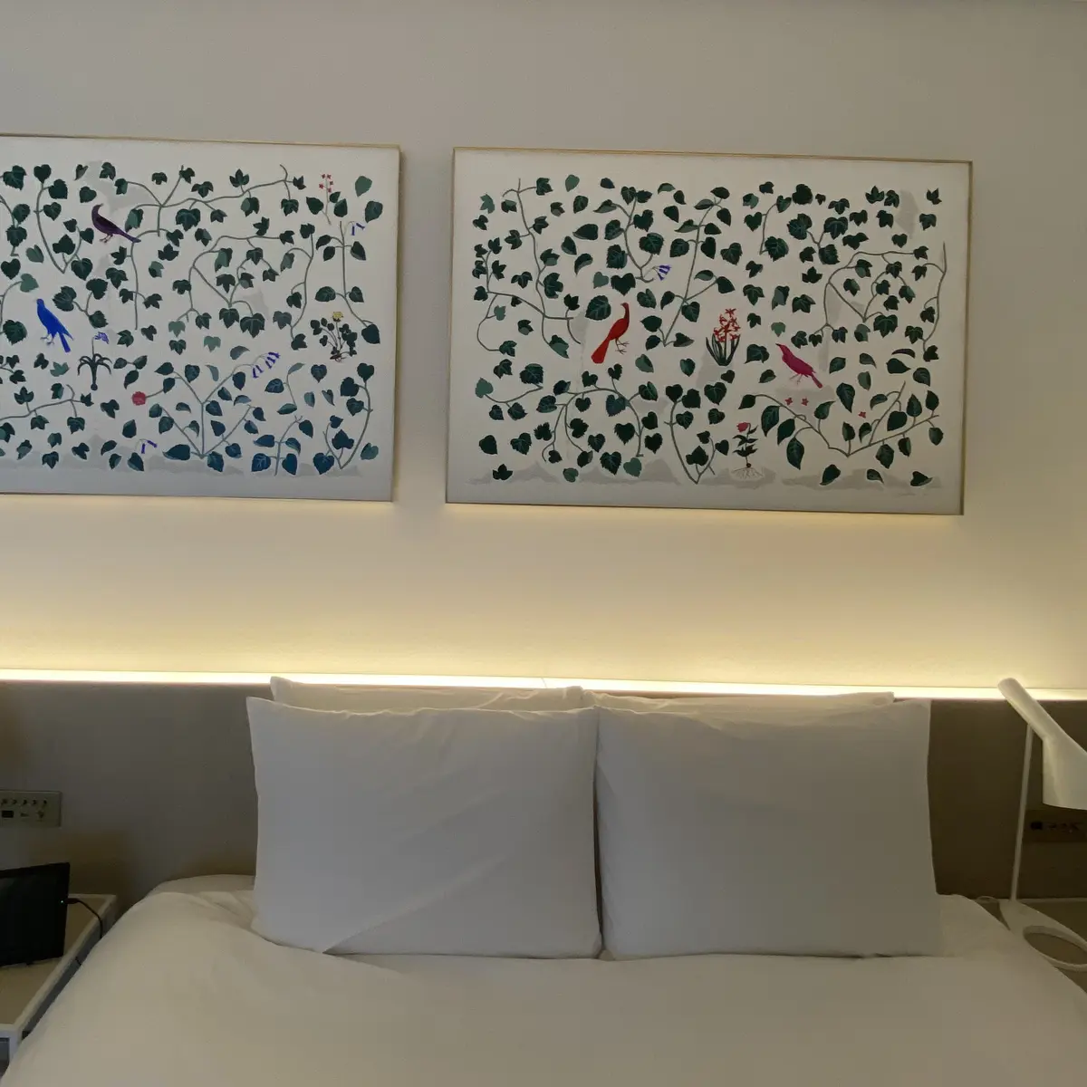 白いお部屋の中にカラフルな葉や鳥、お花の絵が映えて落ち着けるお部屋でした。