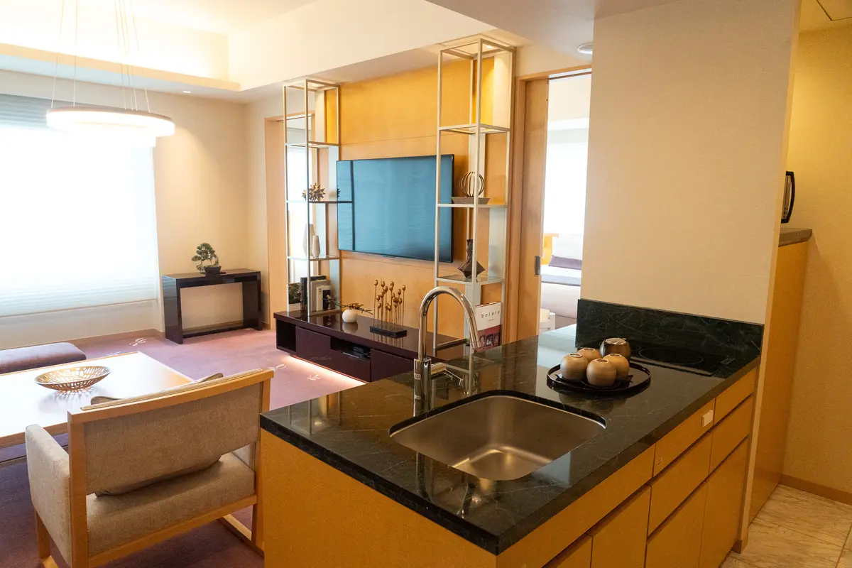 80㎡の広さの中に、IHコンロ付きのキッチン、大型の冷蔵冷凍庫、洗濯乾燥機など、長期滞在にも適した設備が備わっています。「暮らすような滞在」ができるよう、前身のサービスアパートメントの名残を残し、スイート4室には長期の滞在にも便利なキッチンや洗濯機、大きなクローゼットを備えているそう。