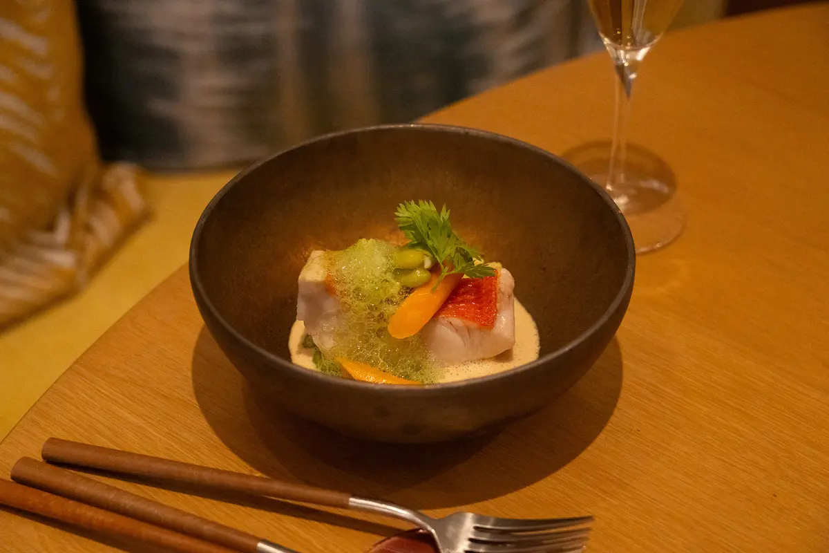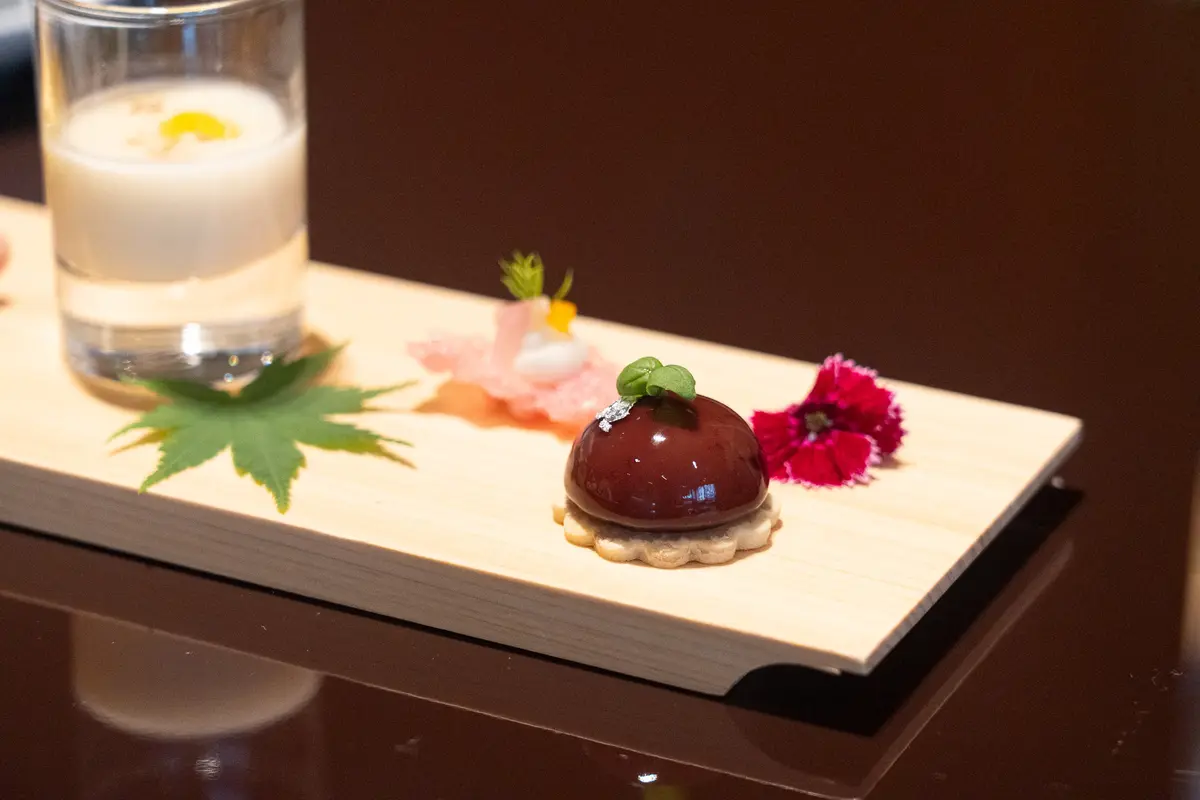 料理を手がけるのは、広島出身の加茂健総料理長。伝統的な和の技と、フランス料理の美意識を融合させたコースは、食材の魅力を最大限に引き出すよう設計されています。一皿ごとに、素材の声が丁寧にすくい取られていて、食べ進めるごとに記憶の奥深くに染み入ってくるような余韻が残ります。