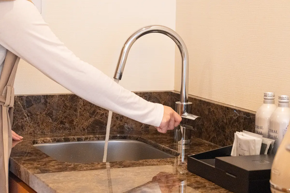 家具には、高級なサクラ材が使われており、木の温もりが感じられる上質なインテリアが、心地よい滞在を演出しています。さらに、バスルームにはゆったりとしたバスタブとレインシャワーを完備。忙しい日常から解放され、身体の芯からリラックスできる空間となっています。