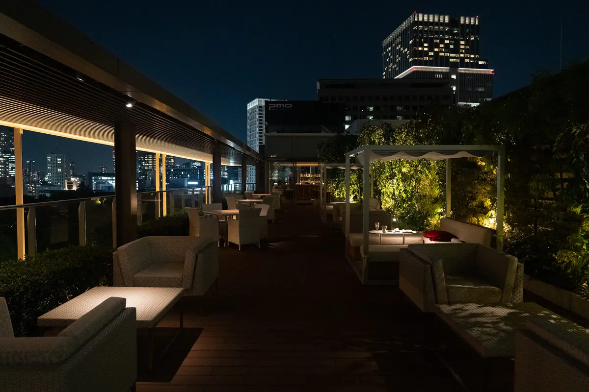 店内は、テラス席に28席、室内にも17席あり、そのいずれからもこの光景を静かに楽しむことができます。特におすすめは、夜景を眺めながらお酒を楽しめるボックス席。この空間が魅せてくれるのは、そっと心に触れるような華やかな夜の東京。高層ビルの灯りが抑揚を奏でる非日常が、呼吸をゆるめてくれる―。そんな、バーラウンジならではの時間を、ぜひ体験してください。