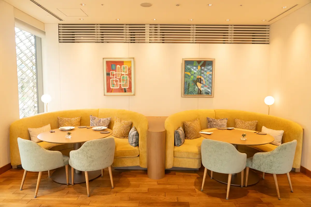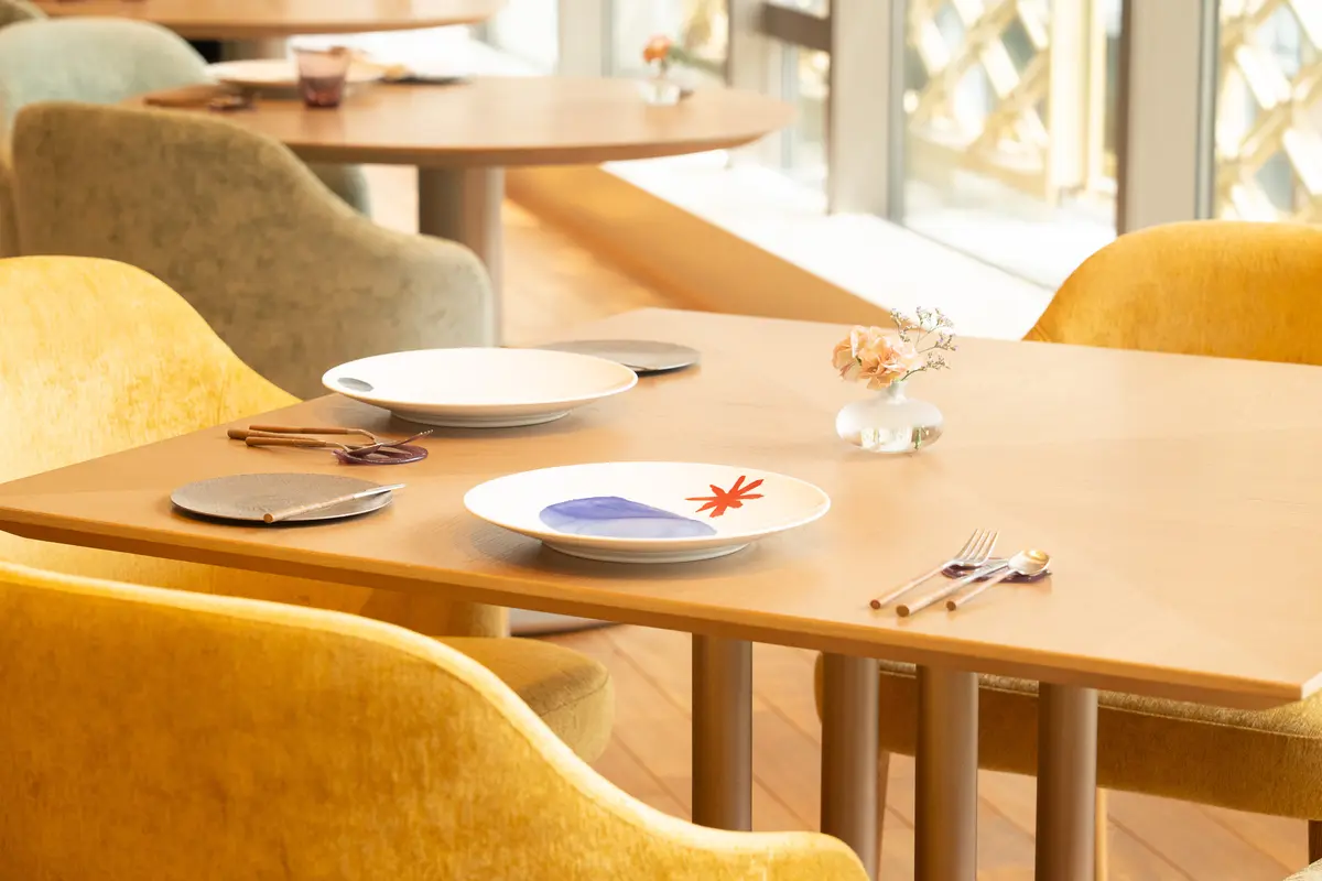 ディナータイムとは雰囲気がガラリと変わる店内にも注目。木のぬくもりを感じる温かい色調のインテリアは、黄色や浅葱色がアクセントとなり、とても柔らかな印象。まるでやさしい朝の光が空間全体を包んでいるかのような心地よさがあります。席と席の間隔にゆとりがあるので、隣席が気にならず、静かに過ごせるのも嬉しいポイントです。