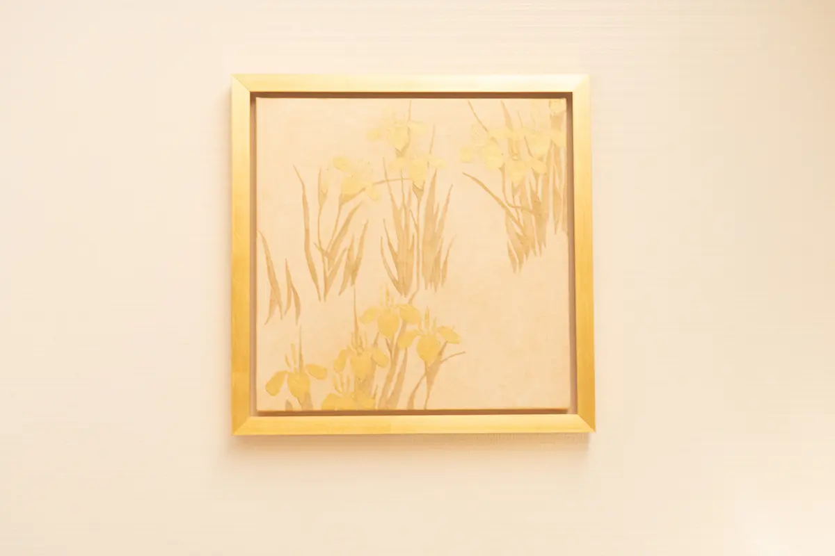 店内は、温かみのある黄色と淡い浅葱色を基調とした和の色合いでまとめられており、訪れる人をほっとさせる柔らかな雰囲気が漂います。さらに、フランスの風景を描いた日本画家・石躍達哉氏の作品が飾られ、空間に上品な彩りと趣を添えています。