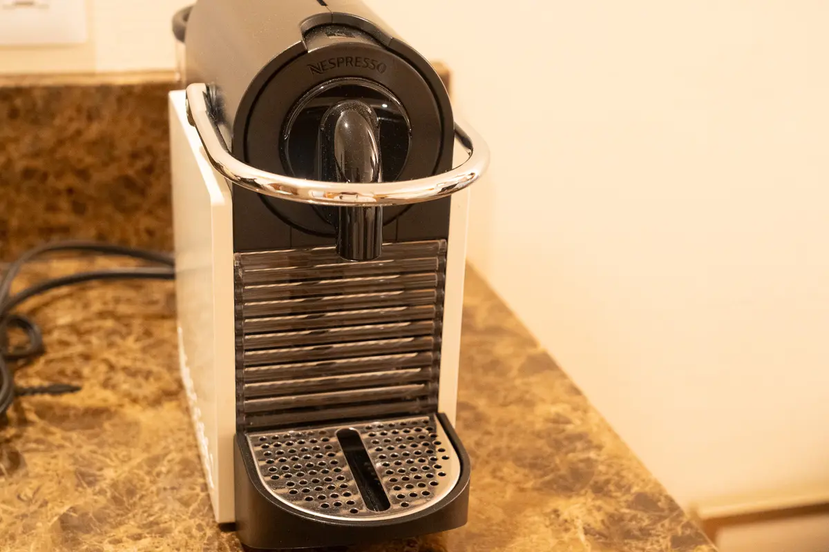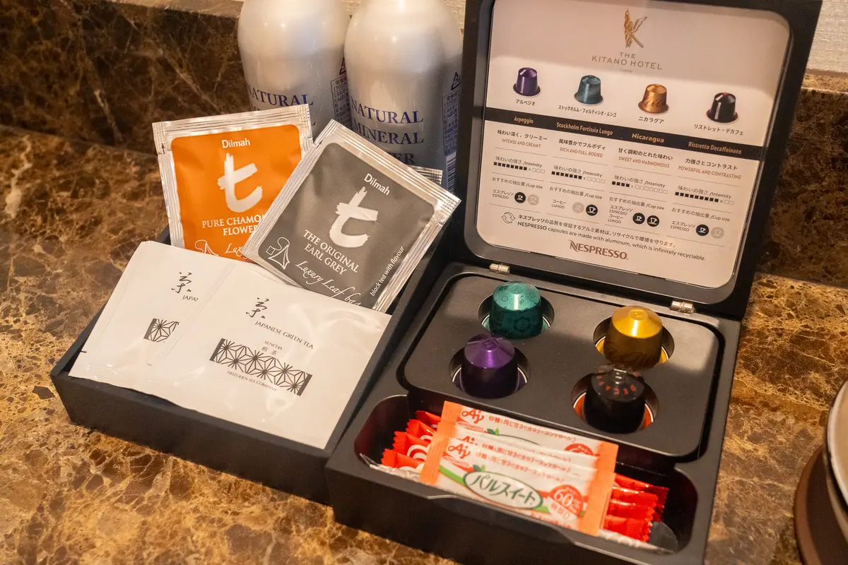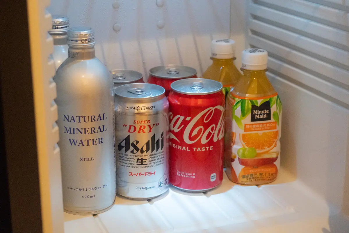 ミニバーに並ぶドリンクは、なんとすべて無料。お部屋に備えられたネスプレッソマシンで淹れるコーヒーをはじめ、ビールやお茶、コーラやオレンジジュースなども自由に楽しめます。