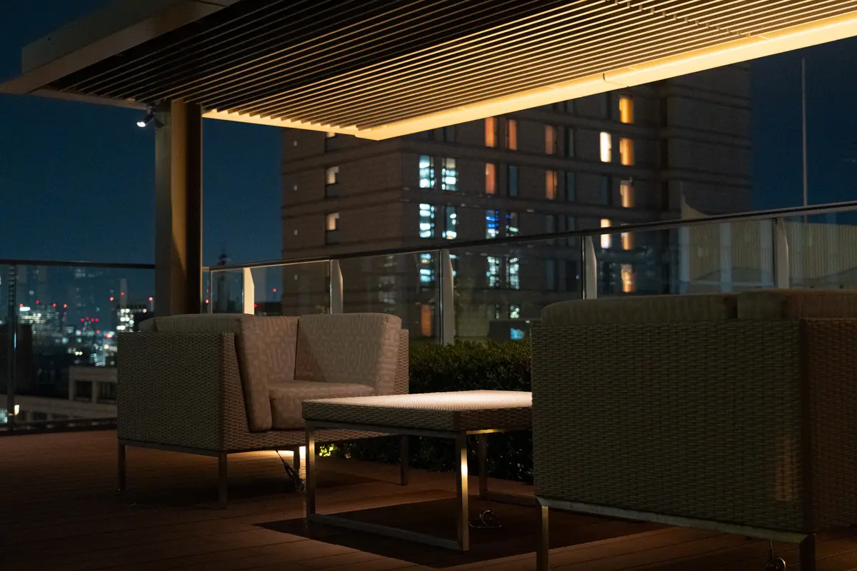 昼は柔らかな自然光が入り、夜はテラスから、皇居と丸の内の夜景が一望できる印象的な空間。まさに、昼と夜とで全く異なる表情を見せる“大人の隠れ家”ですこの場所では、喧騒から離れた場所だからこそ味わえる”静けさの贅沢"が味わえます。その穏やかな景色が、1日の終わりを優しく包んでくれるように感じます。