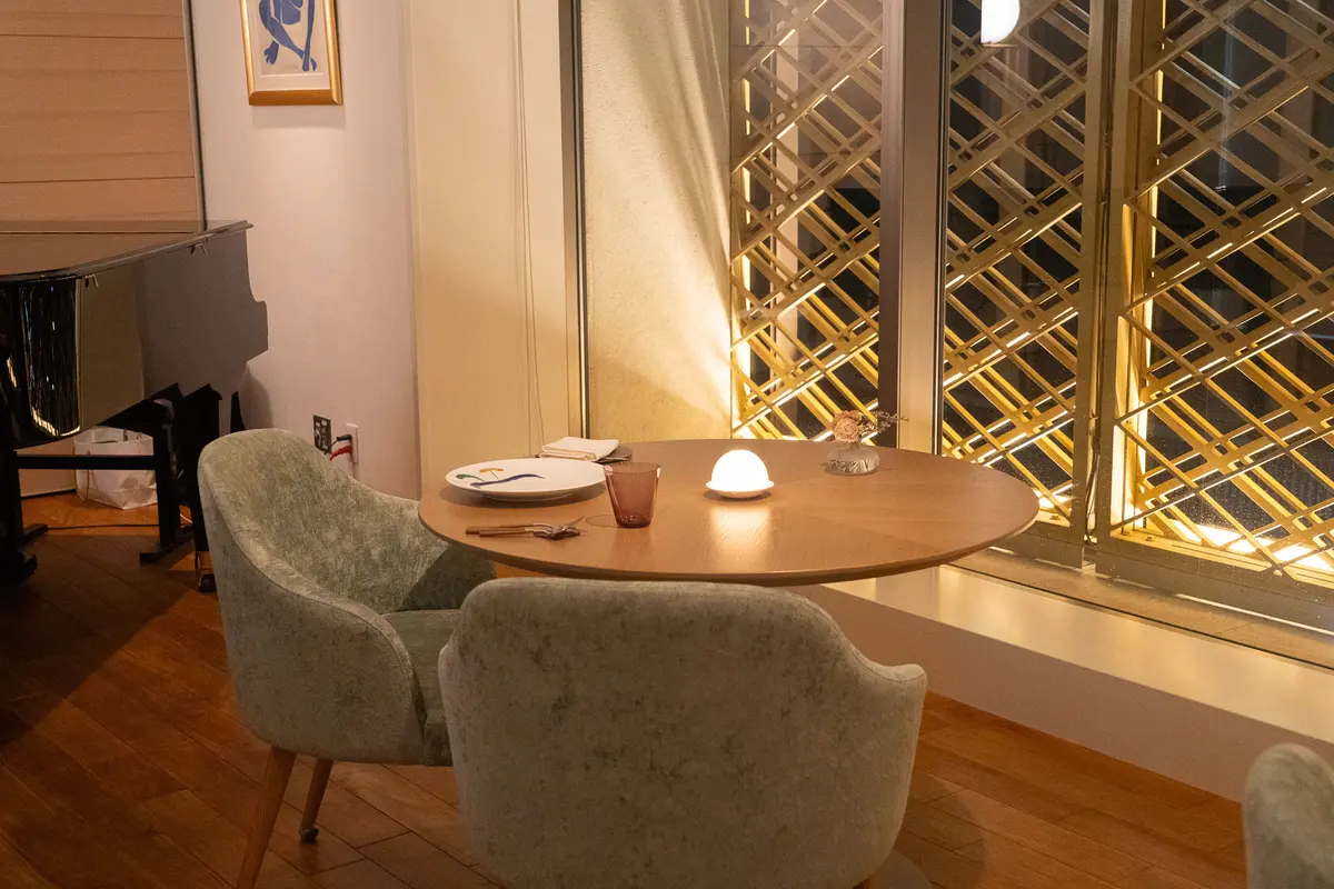 店内は、上質な木材を用いたインテリアに、控えめながら洗練された照明が美しく調和し、心を静かに整えてくれます。まるで美術館の一角にある茶室のような趣き。窓越しにのぞく緑の揺らぎが、時の流れをゆるやかにしてくれます...!