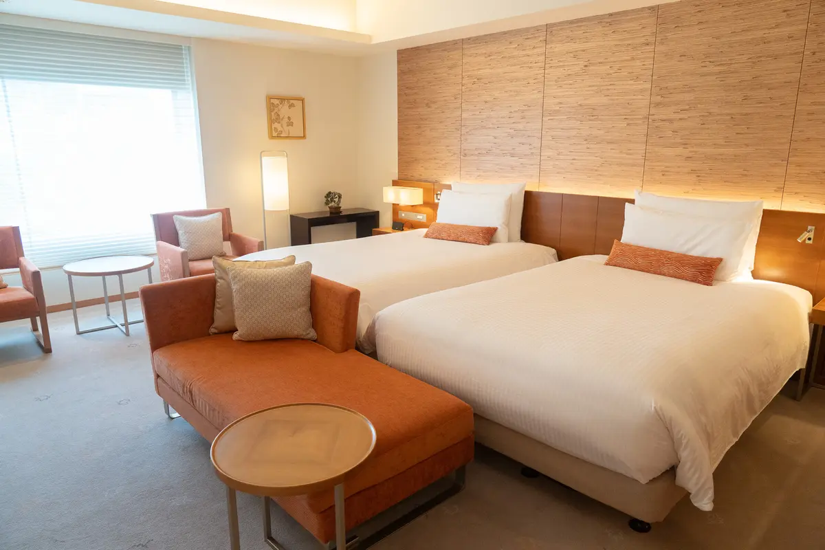 プレミアフロアにある「プレミアデラックスルーム」は、47㎡の広さがある、ゆったりとしたツインタイプのお部屋。落ち着いた“秋”の色調がテーマになっていて、深みのある色味のインテリアと、シカモア材の家具、大理石のアクセントが印象的です。しっとりとした空気感に、思わず背筋が緩まります。