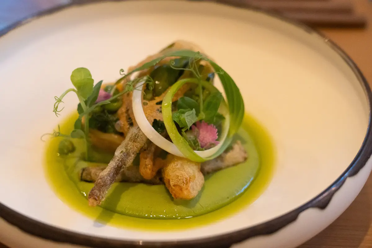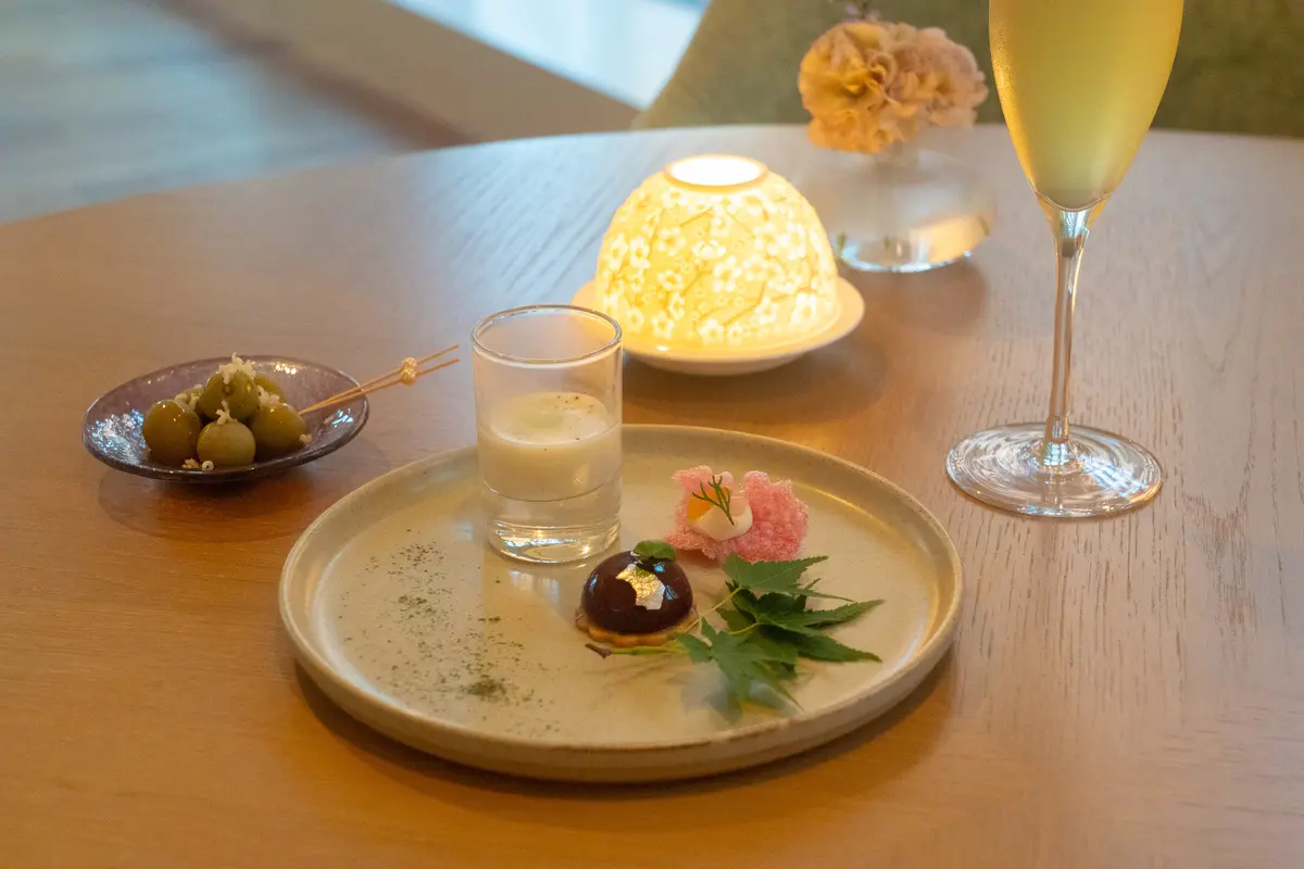 料理は、四季折々の旬の素材を取り入れた和洋折衷スタイル。シェフが丹念に仕立てた一皿一皿は、盛り付けも美しく、最初のひと口から最後の余韻まで、五感をやさしく刺激してくれるような料理ばかり。