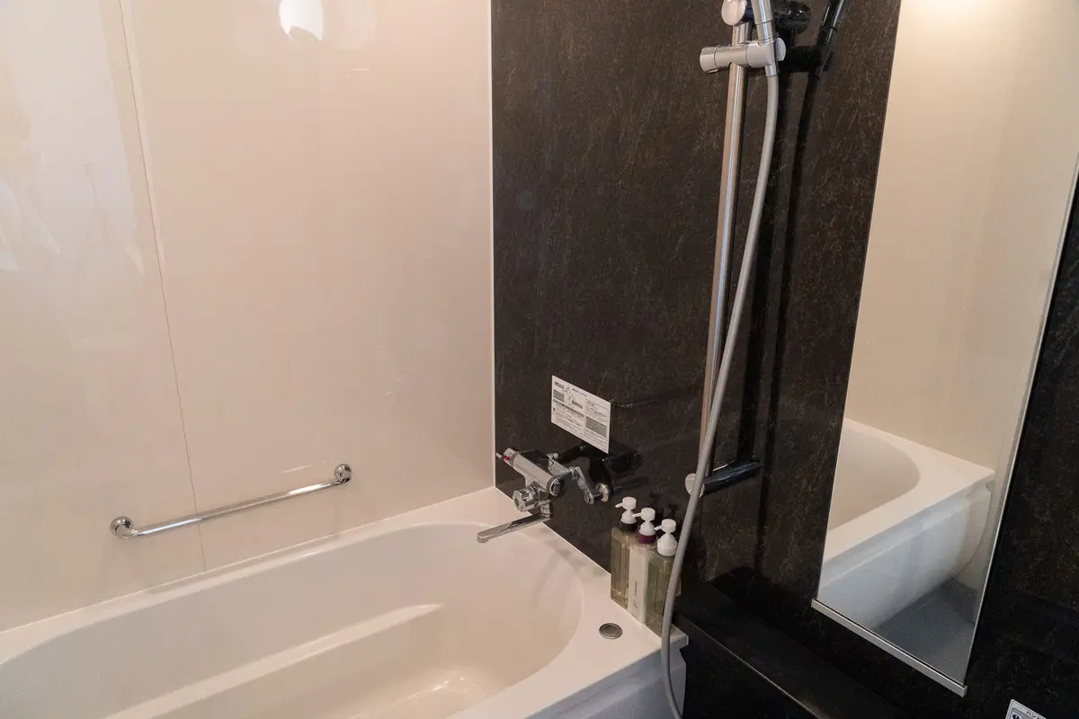 バスルームは、足を伸ばせるしっかり深めのバスタブがあり、ゆっくりお湯に浸かって旅の疲れを癒せます。シャワーの水圧や温度調整もスムーズで、アメニティも充実。お部屋で“ちゃんとお風呂に入りたい派”にとっては、かなり満足度の高いバスルームでした。