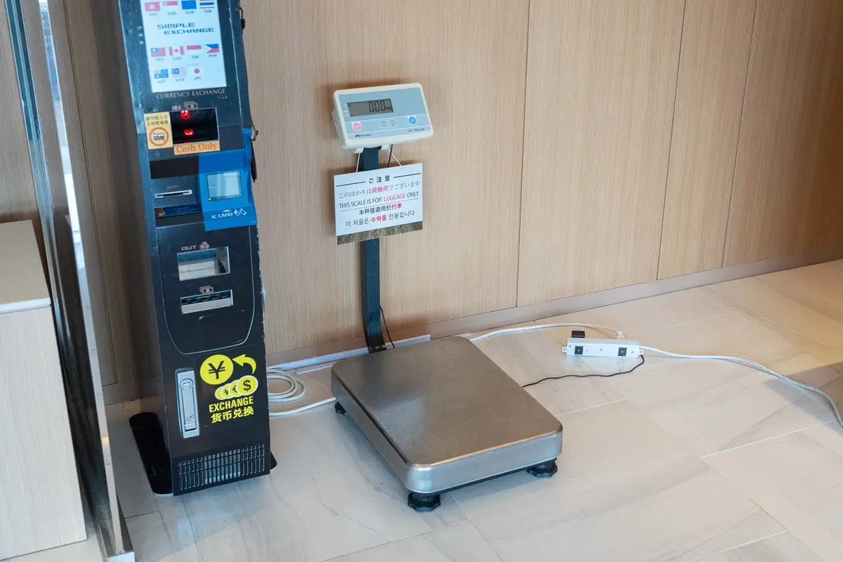チェックイン手続きは自動精算機でスムーズに完了。操作方法がわからない場合でも、近くにスタッフの方が常駐していて、丁寧にサポートしてくださいます。また、両替機やスーツケースの重さを測るスケールも設置されています。こうした細やかなサービスが、リッチモンドホテルならではの安心感だと感じました。