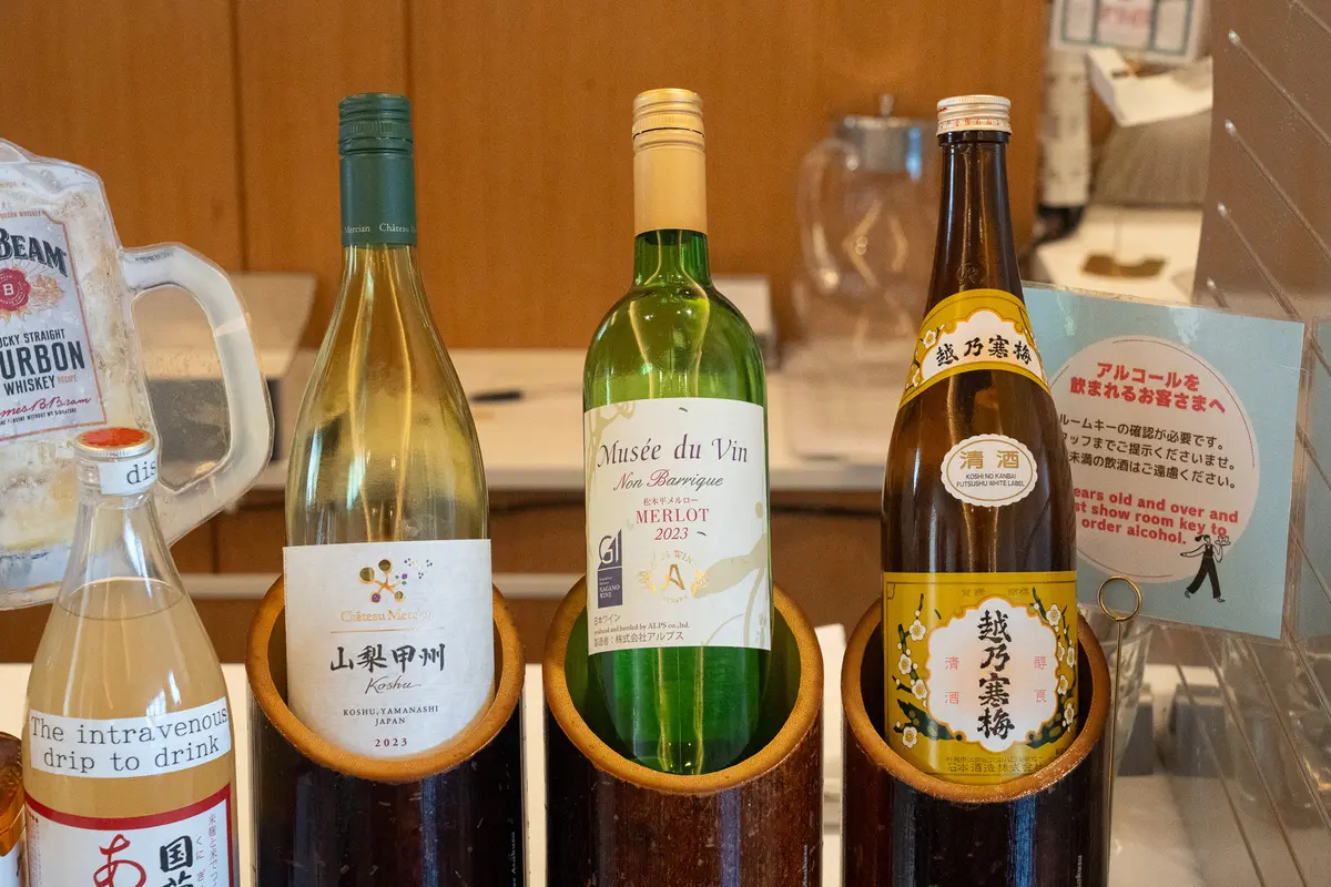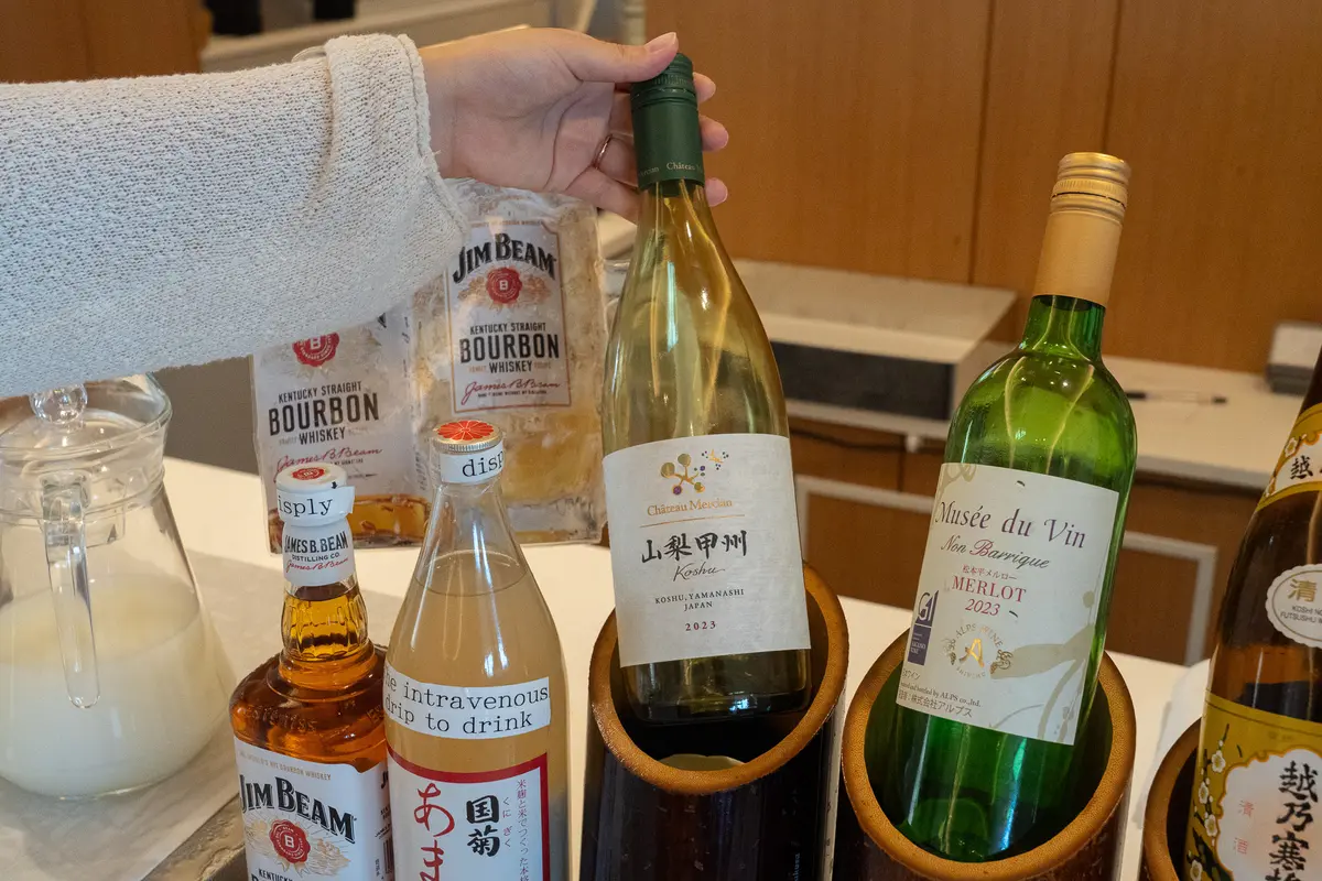 甘酒、ハイボール、白ワイン、赤ワイン、日本酒といったアルコール類も用意されていました。予定の合間や食事の前に軽く1杯…というのも気軽に叶います。