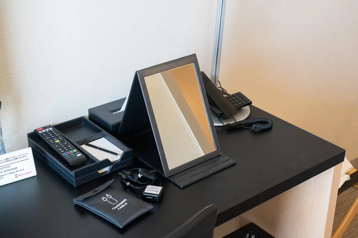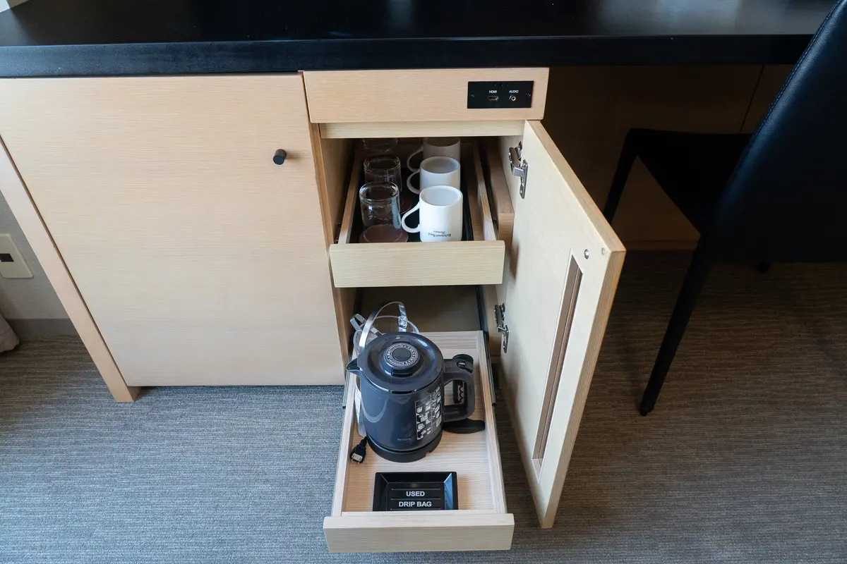 また、壁際には幅広のワークデスクも完備されていて、PC作業や軽い書き物などにも十分なスペースがあります。観光だけでなく、ワーケーションにもぴったりな環境だと感じました。