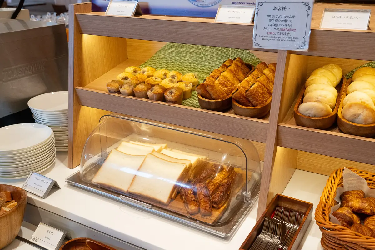 ビュッフェのパンコーナーには、焼き立てパンやマフィンが並んでいて、質にこだわった品揃えが印象的でした。特に、「ミセス・エリザベスのマフィン」は絶対に見逃せません。しっとりと重すぎない生地に、ほんのり香るバナナの甘みが優しく、朝のコーヒーとの相性も抜群です!
