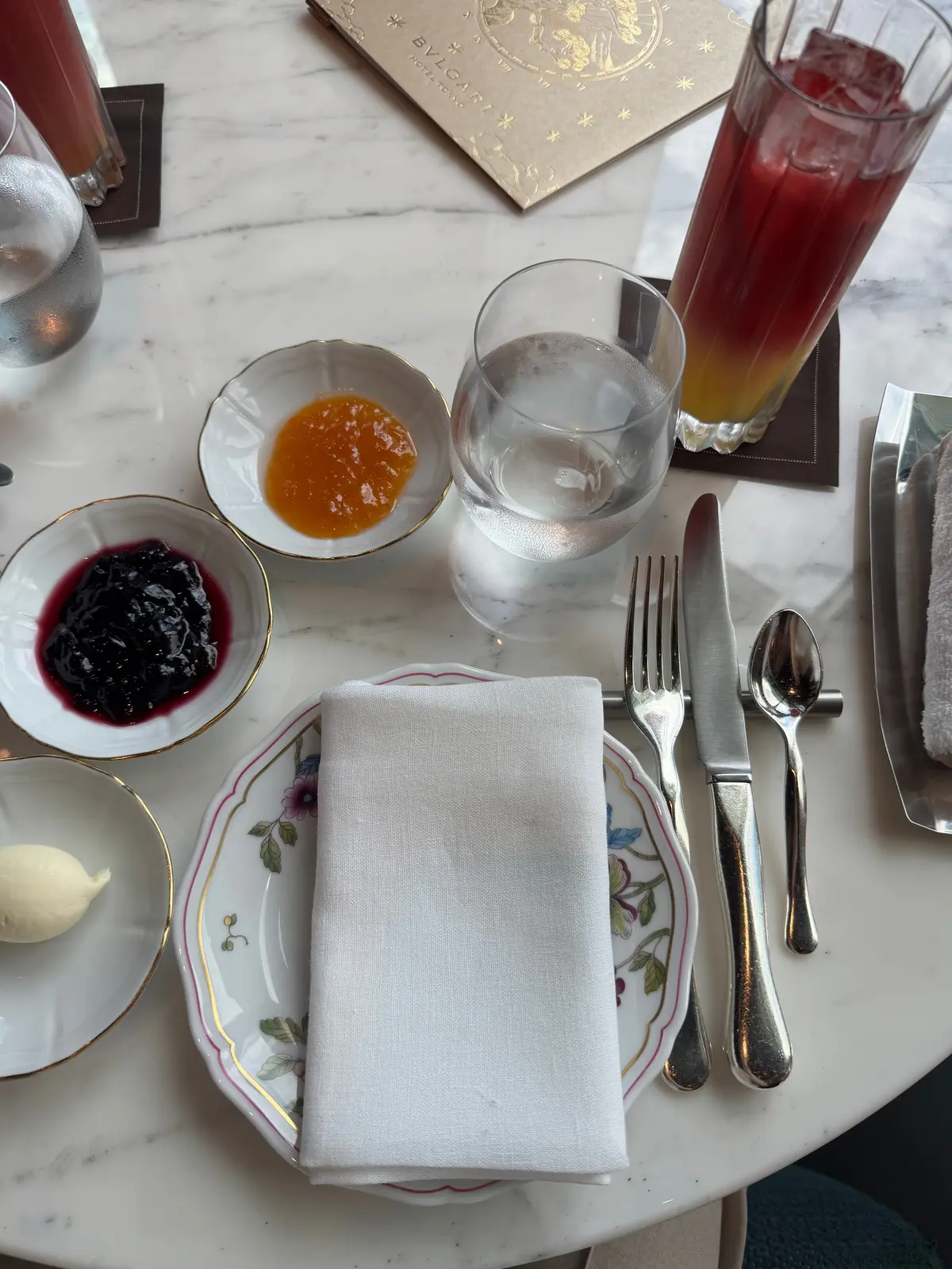 真ん中の、綺麗な陶器に入っているのはBVLGARI流スコーンなのですが、これが珍しくて驚き。外カリカリ、中もちふわな生地に、甘さは控えめで、大好きな味でした。一緒についてくるジャムや、クリームを付けても美味しかった☺️