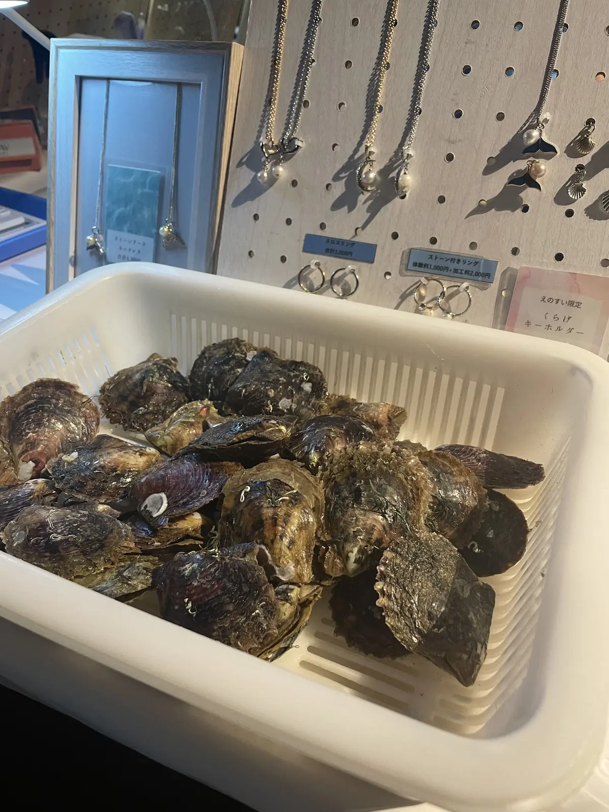 貝を選んだら自分で開ける。出てきた真珠は、ピアスやネックレス、指輪、キーホルダーなど加工してもらえます✨