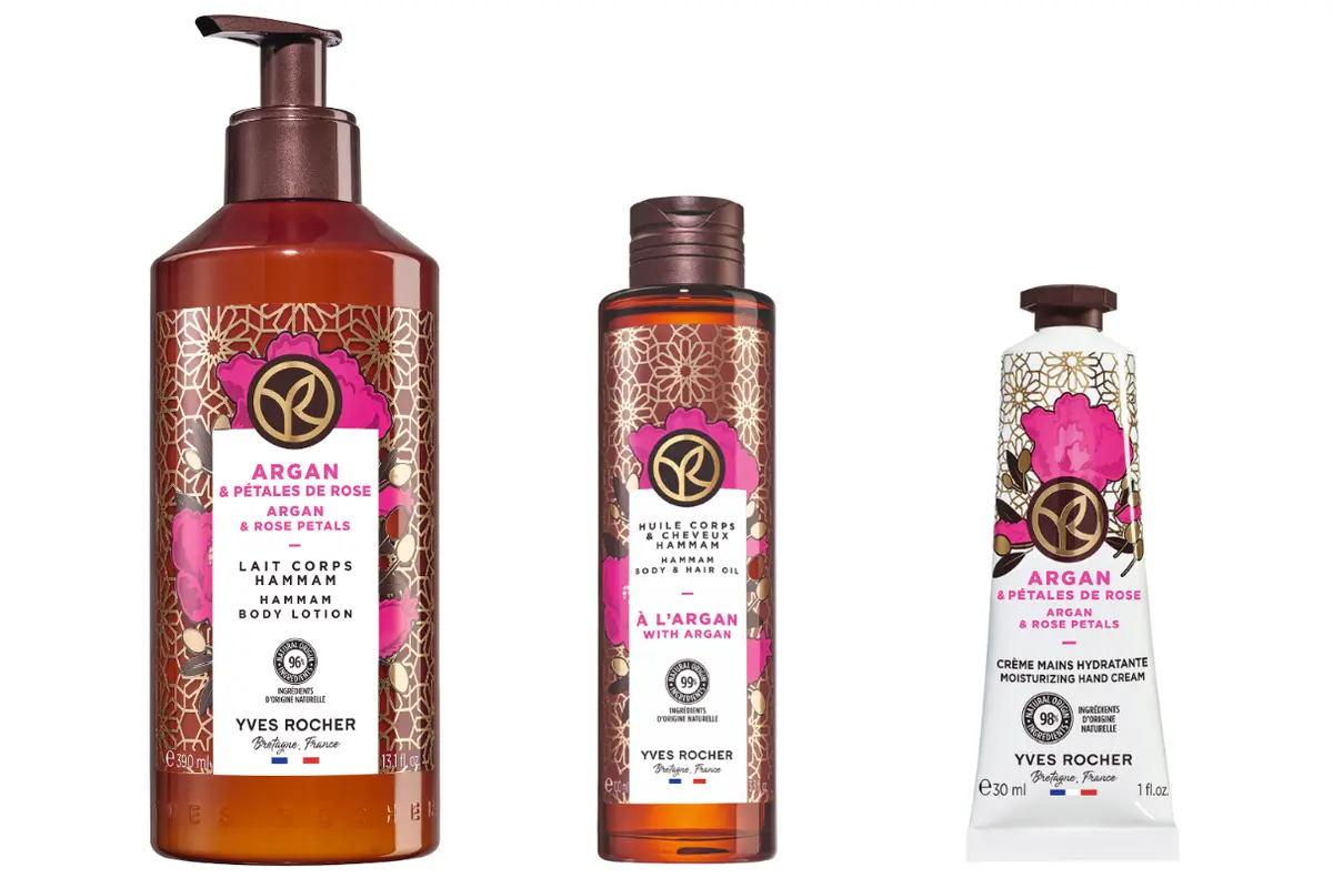 (左から)イヴ・ロシェ 【ボディローション】アルガンローズ・ハマムメロー 390mL¥1980、【ボディ&ヘアオイル】アルガンローズ・ハマムドロージー 100mL¥3080、【ハンドクリーム】アルガンローズ・ハマムイーズ 30mL¥990